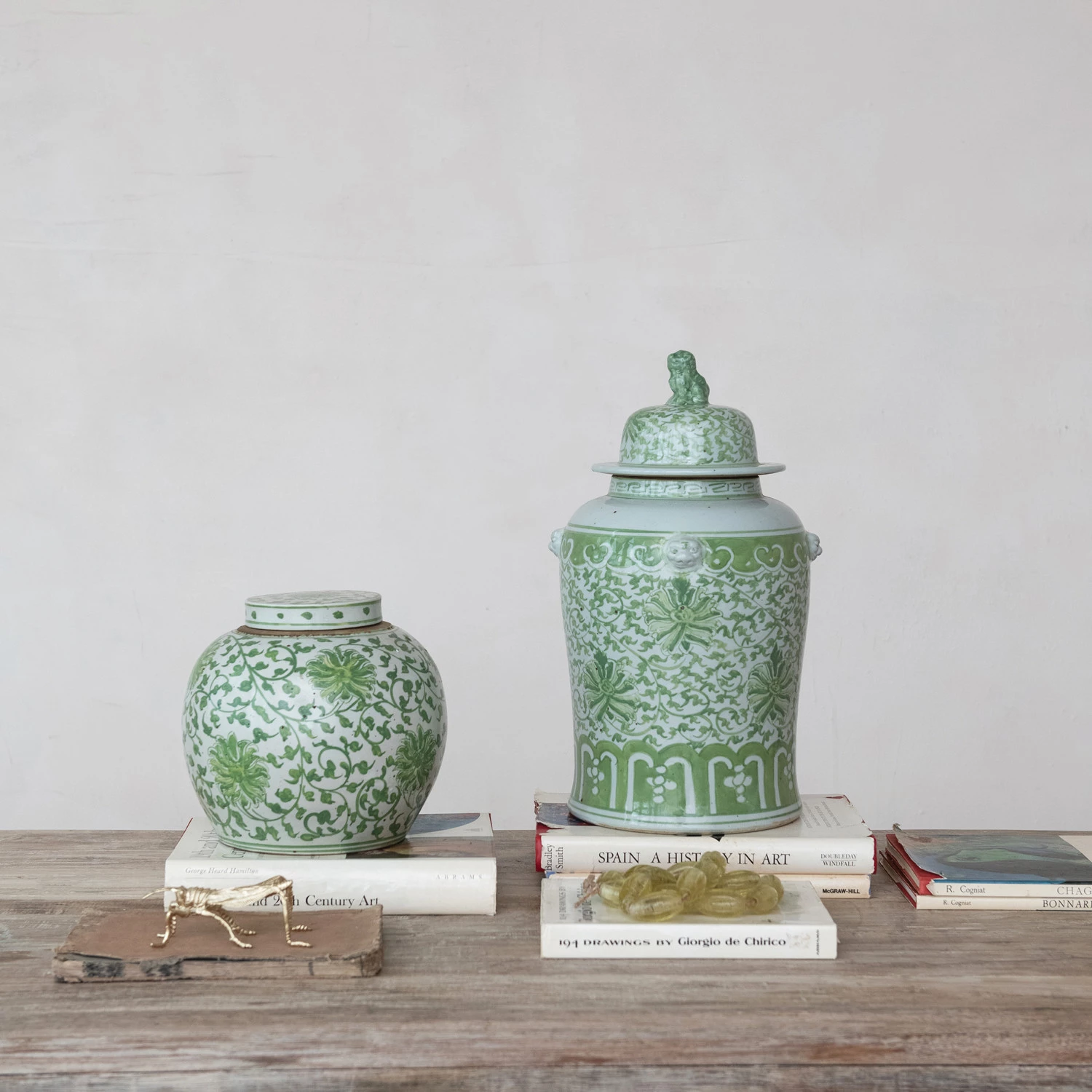 Decorative Hand-Painted Stoneware Ginger Jar w/ Floral Pattern, Green & White