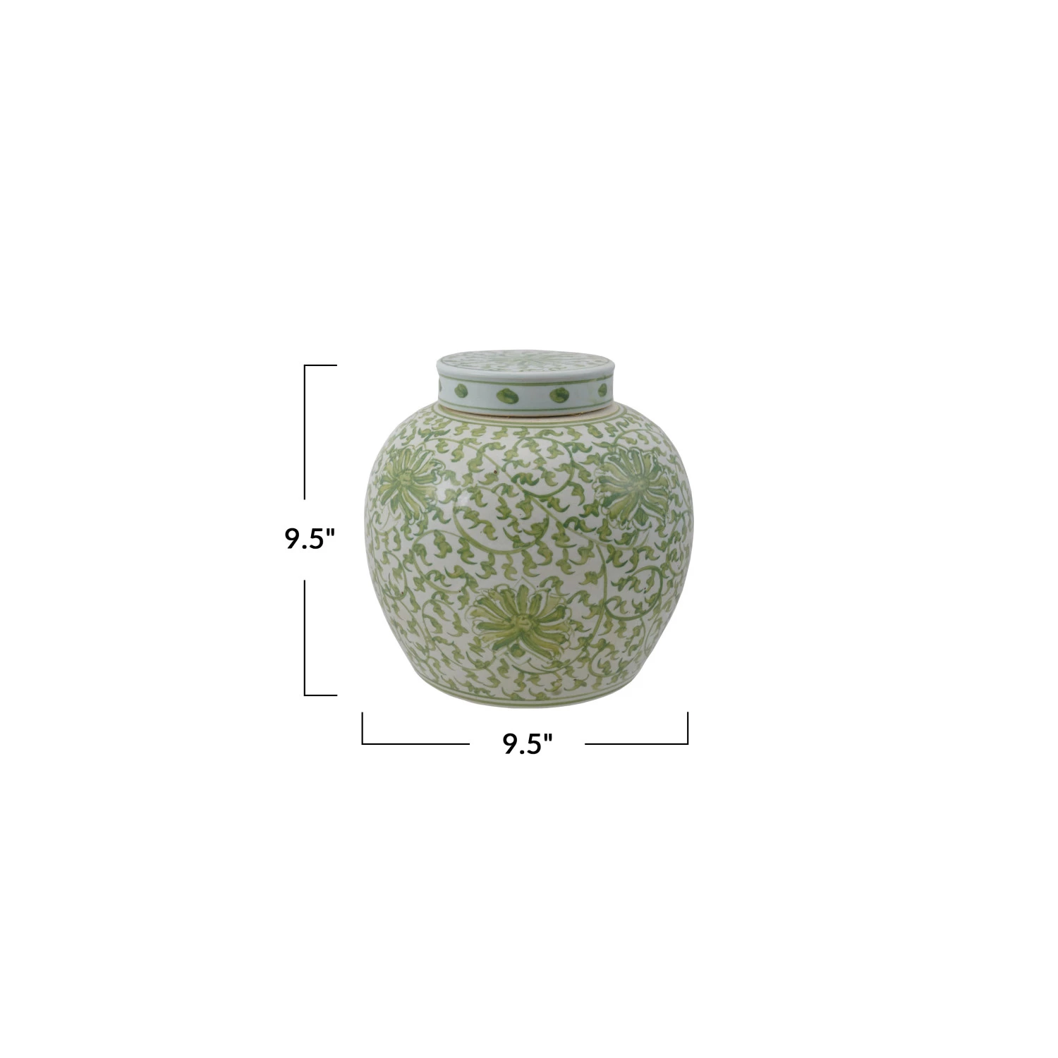 Catalog Name: 9-1/2" Round x 9-1/2"H Decorative Hand-Painted Stoneware Ginger Jar w/ Floral Pattern, Green & White