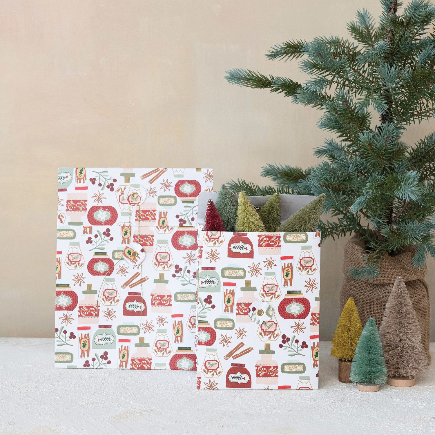 This set of 2 printed paper gift bags is the perfect wrapping solution for the holiday season. The multi-colored patterns adorned with brass accents give these bags a touch of sophistication, while the brass handles ensure durability and easy carrying. The larger bag measures 9 inches in length, 4 inches in width, and 11.5 inches in height, and the smaller one is 6.5 inches long, 3.5 inches wide, and 8.5 inches high, making them ideal for gifts of different sizes. Whether it's for a secret Santa, a thoughtful gift for a loved one, or a token of appreciation for a colleague, these bags will make every present stand out under the Christmas tree. A duo of paper gift bags, each boasting a vibrant holiday pattern and brass detailing, ready to spread festive cheer. An excellent choice for seasonal gifting, these bags elevate presents with their joyful designs and elegant brass handles. Ideal for wrapping holiday gifts, these bags are versatile for Christmas exchanges, office parties, or family gatherings.