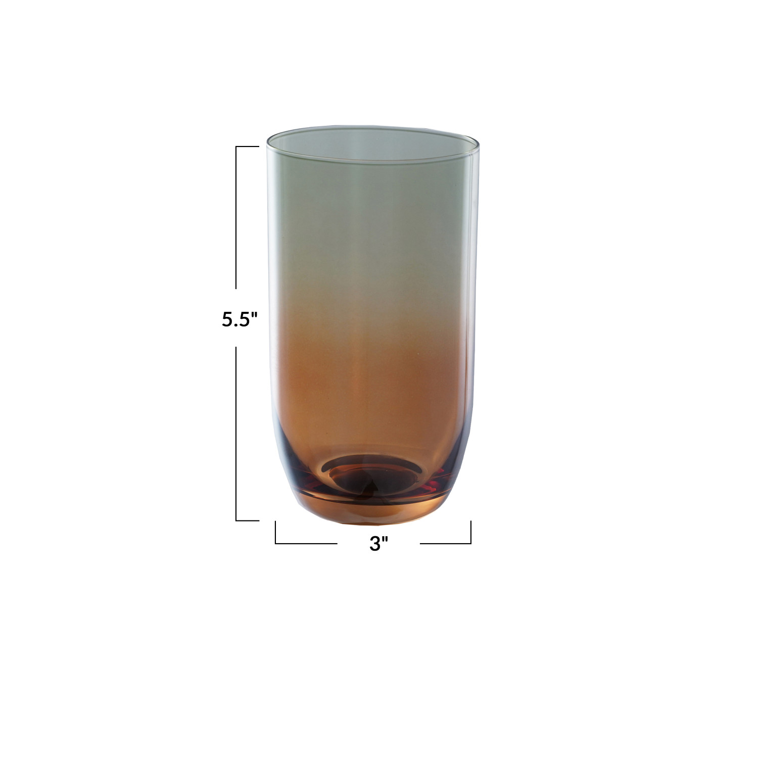 Catalog Name: 3" Round x 5-1/2"H 16 oz. Drinking Glass, Iridescent Finish, Amber Color & Green Ombre