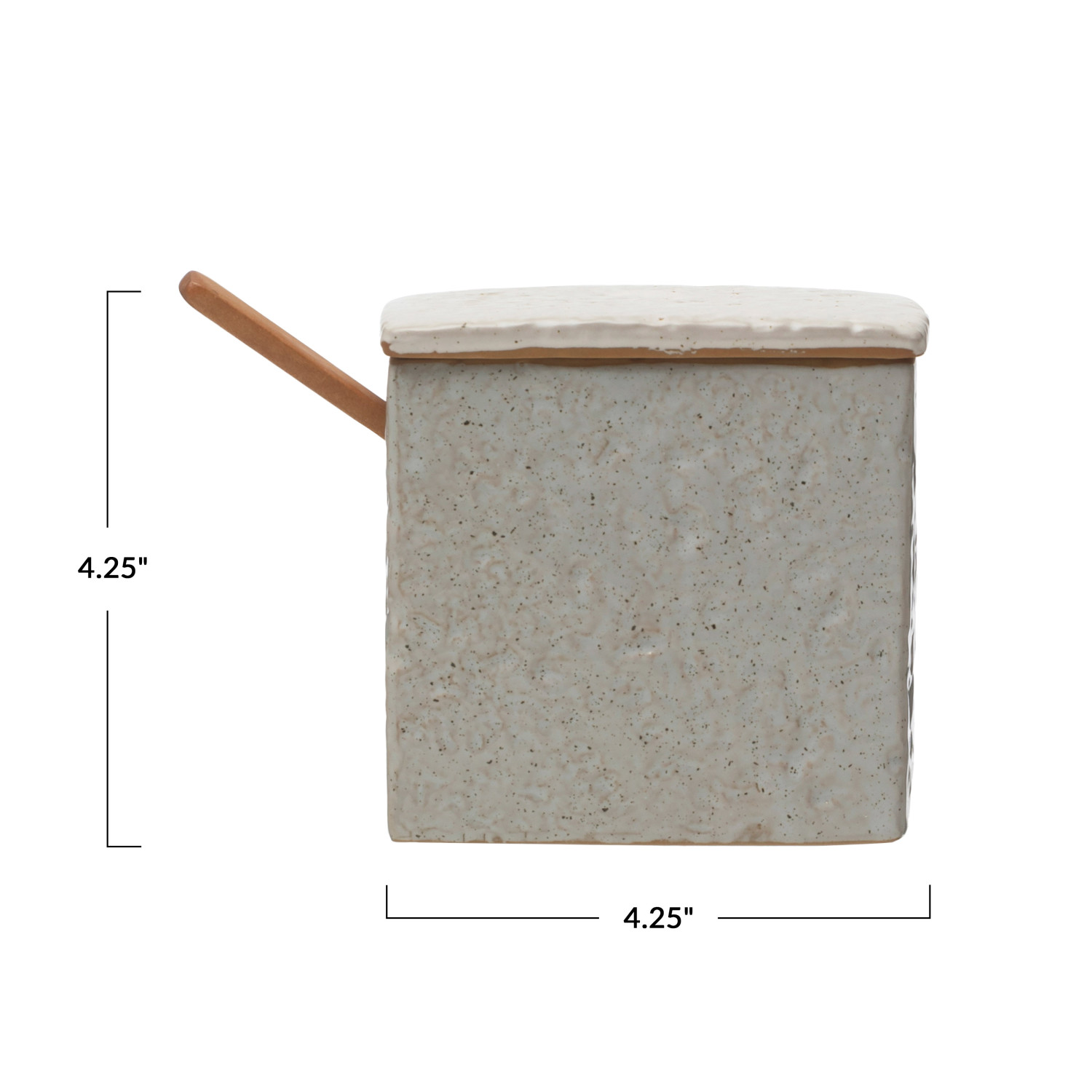 Catalog Name: 4-1/4" Square x 4-1/4"H Textured Stoneware Salt Cellar w/ Pine Wood Spoon, Reactive Glaze, White, Set of 2 (Each One Will Vary)