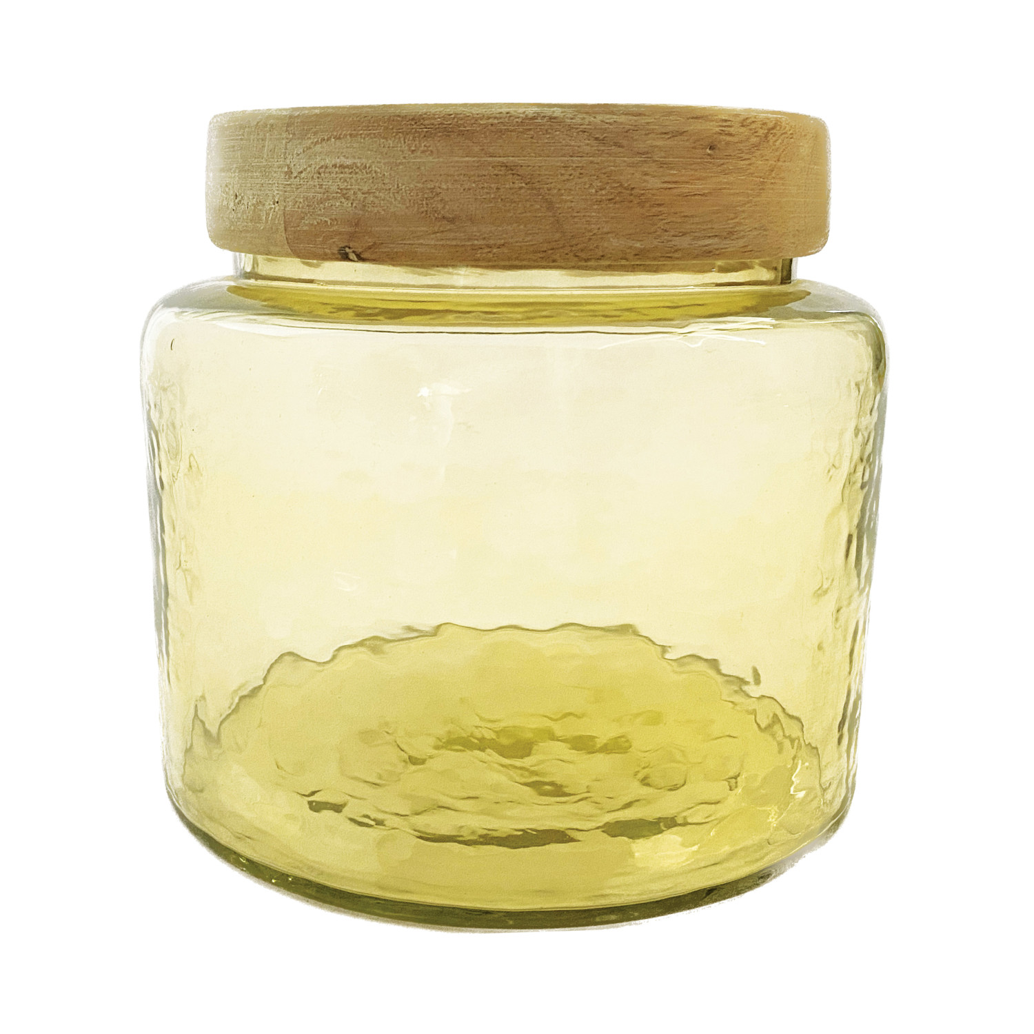 Catalog Name: 6" Round x 5-1/2"H 1-1/2 Quart Hammered Glass Jar w/ Mango Wood Lid, Yellow & Whitewashed