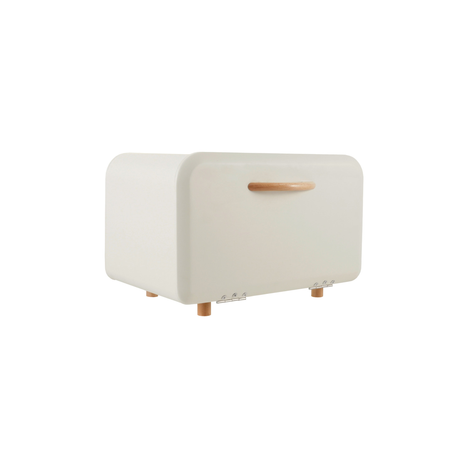 Metal Bread Box with Wood Handle & Feet, Matte Cream Color & Natural