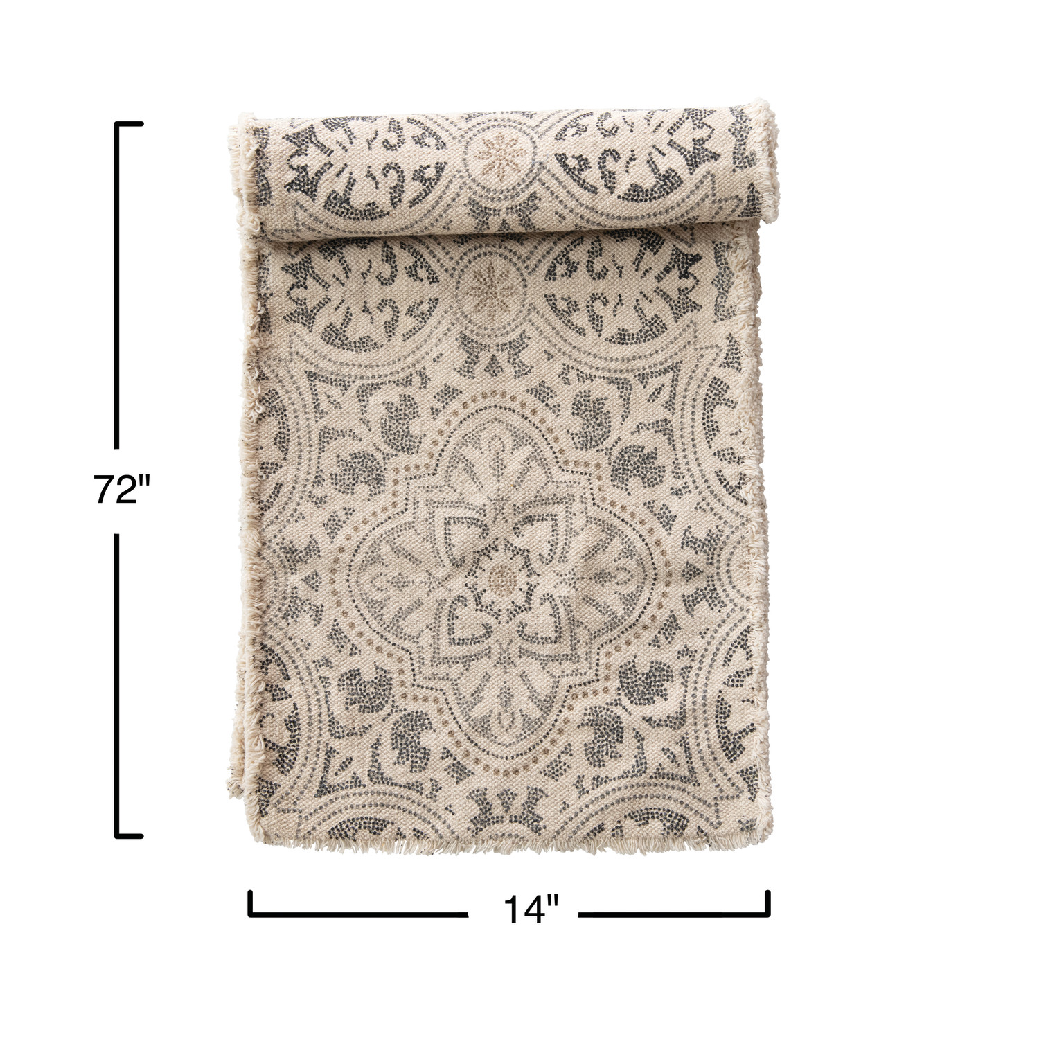 Catalog Name: 72"L x 14"W Cotton Printed Table Runner w/ Fringe, Grey & Cream Color