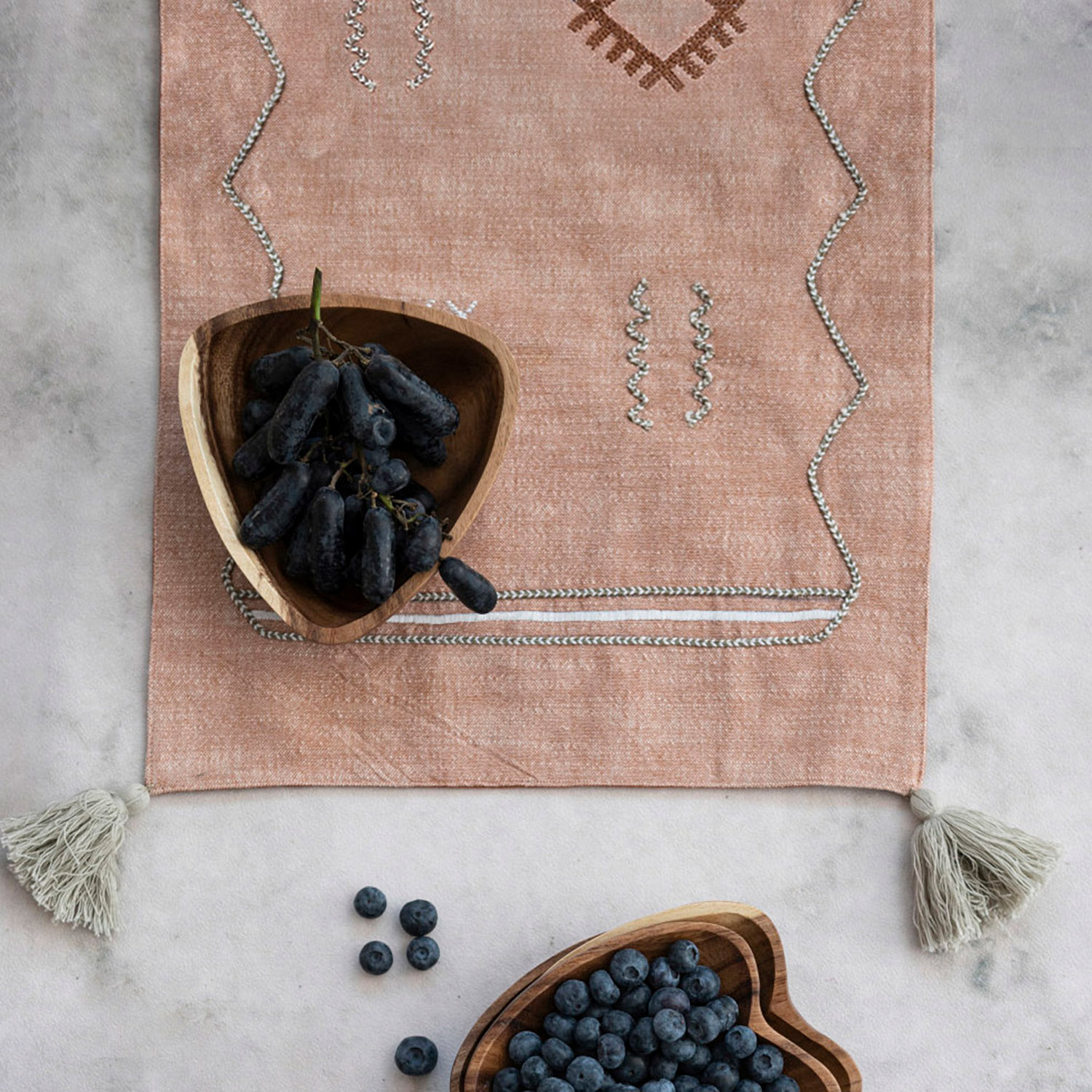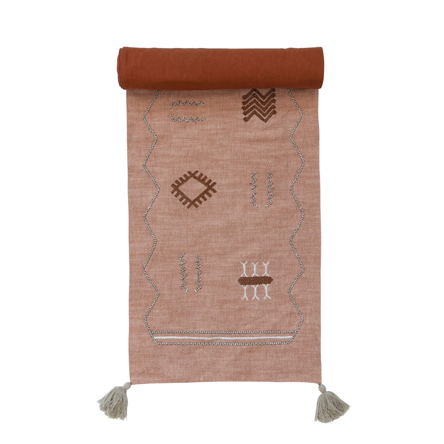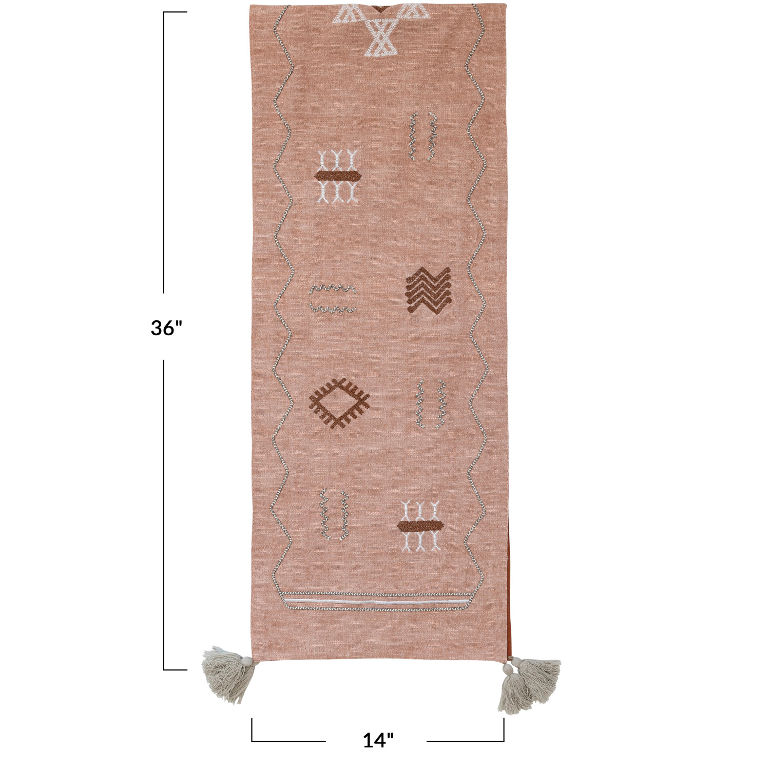 Featuring a vast selection of lush woven textures, intricate details, and timeless patterns, our collection of entertaining textiles and accessories will bring warmth and elegance to a dining space of any style. Instantly transform a breakfast nook or dining room into a sophisticated sanctuary by exploring a vast array of textiles and accessories fit for any space including table runners, napkin sets, placemats, napkin rings, tea towels, dish cloths, sponge cloths, pot holders, food pouches, aprons, and so much more. Choose from a wide variety of luxurious fabrics from cotton and velvet to linen and seagrass, and styles from mid-century modern and boho to classic farmhouse and contemporary. This global-inspired table runner features intricately embroidered geometric designs on cotton, finished with decorative tassels. Display in a living or dining space of any style from Scandinavian to boho. Dry Clean or Hand Wash. Made from cotton.