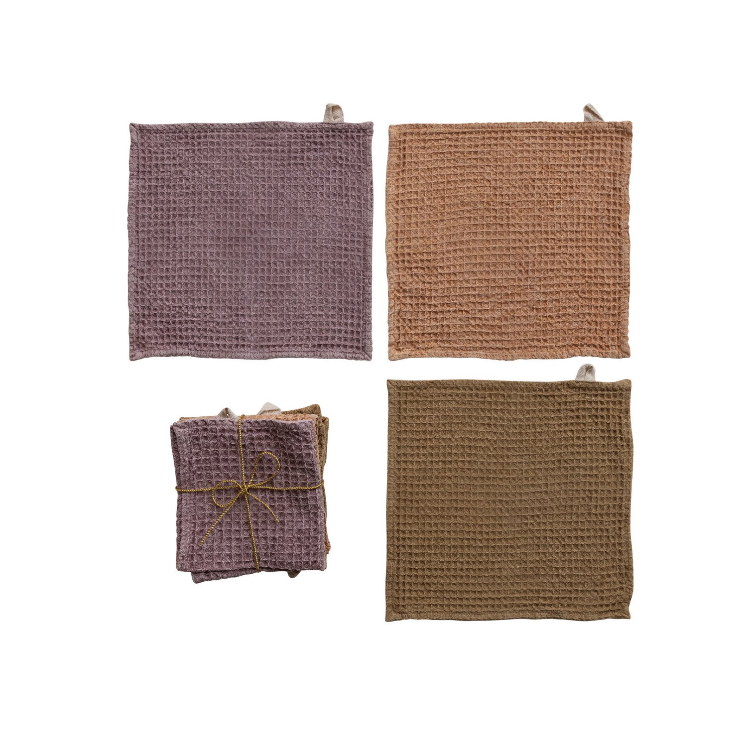 Catalog Name: 10-1/2" Square Stonewashed Cotton Waffle Weave Dish Cloths, Multi Color, Set of 3 Tied w/ Gold Cord