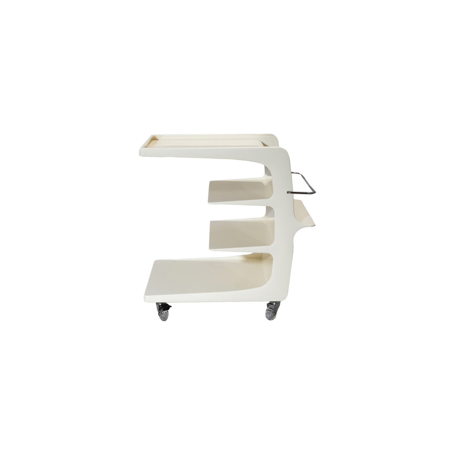 Plastic Cart on Casters w/ 3 Shelves, Book Ledge & Bar, Cream Color & Chrome Finish