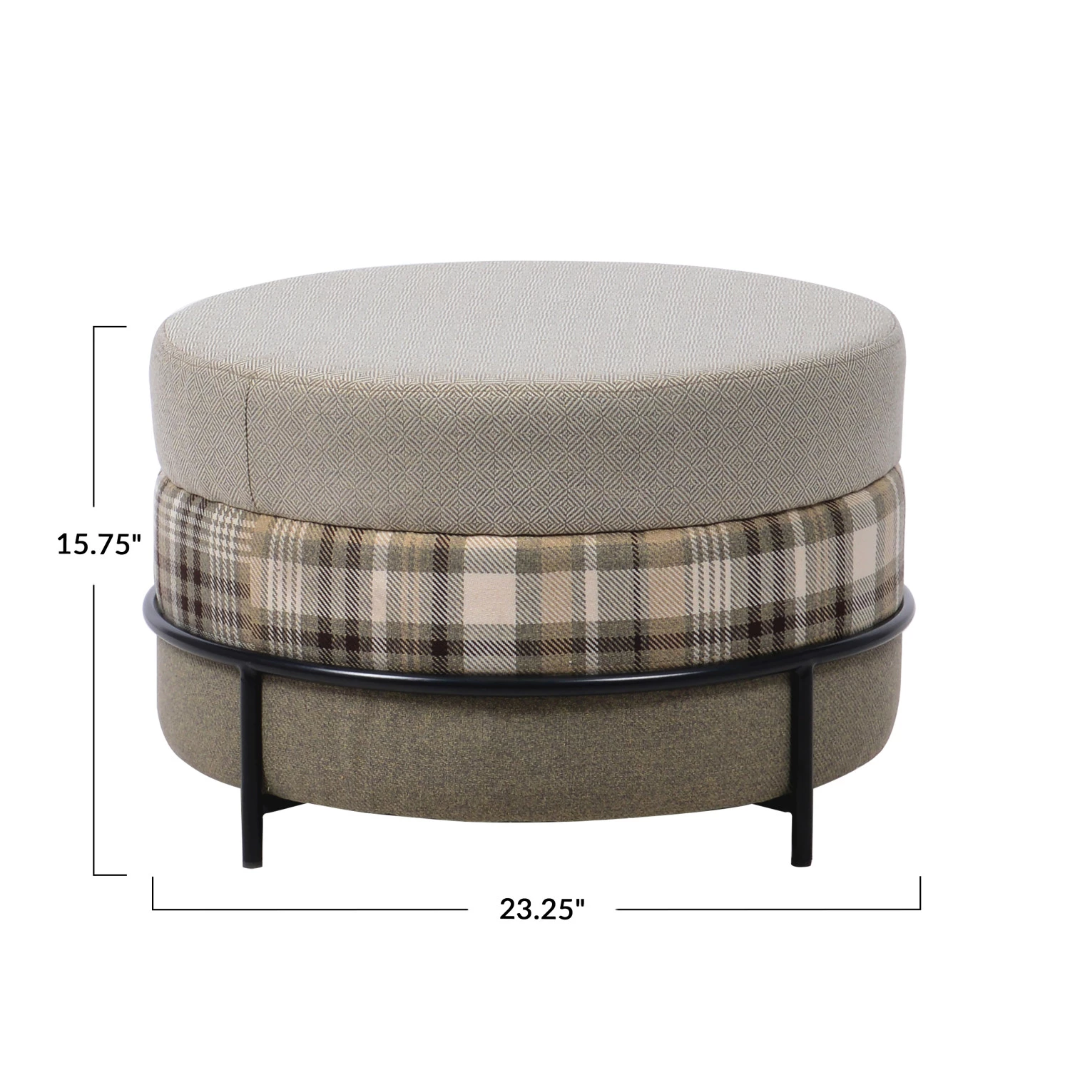 Catalog Name: 23-1/4" Round x 15-3/4"H MDF & Fabric Upholstered Ottoman w/ Black Metal Legs, Multi Color