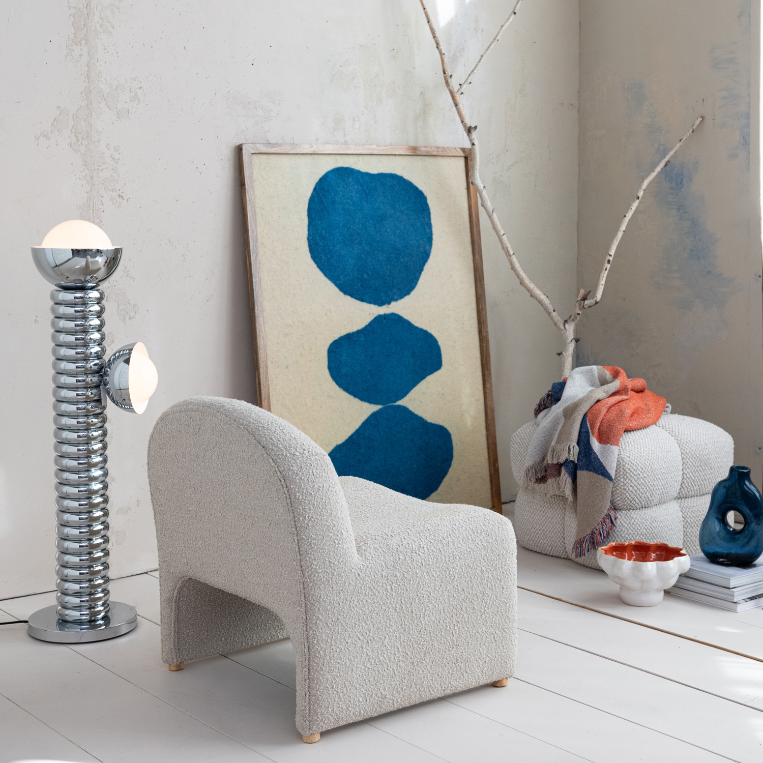 Bouclé Fabric Upholstered Tufted Ottoman, Cream Color