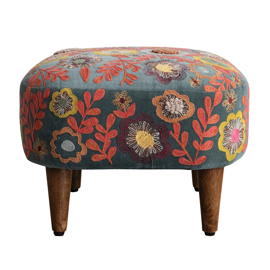 Cotton Velvet Embroidered Stool with Mango Wood Legs & Flowers & Natural