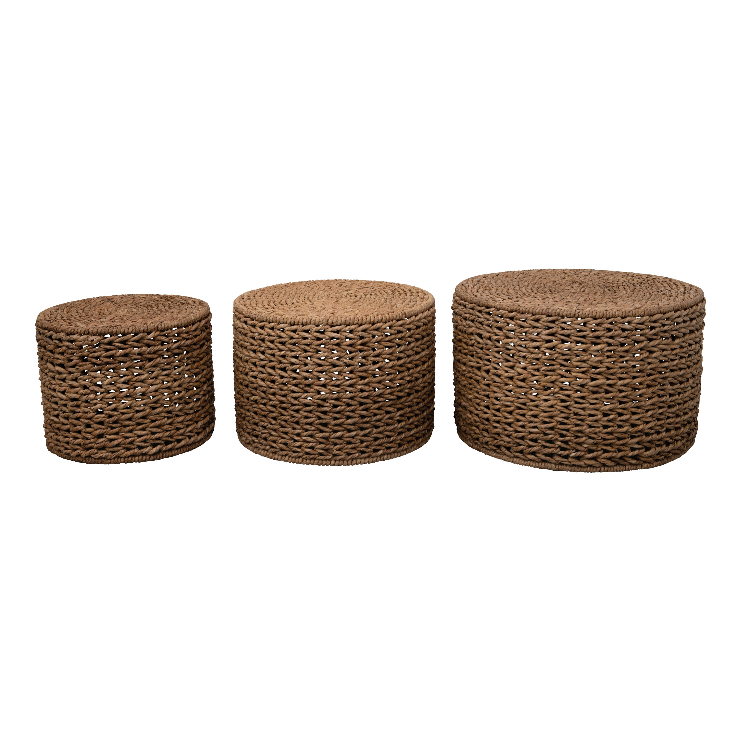 Catalog Name: 29" Round x 19"H, 24" Round x 17"H & 20-1/2" Round x 16"H Hand-Woven Water Hyacinth Nesting Tables, Natural, Set of 3