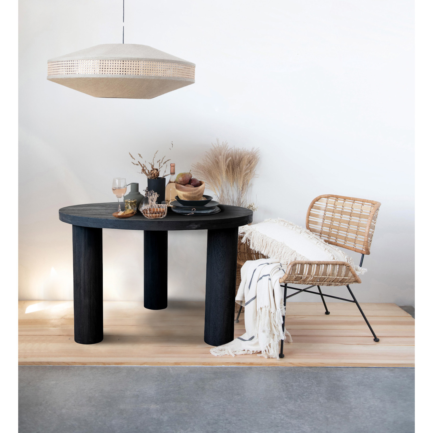 This black mango wood round dining table is a beautiful and functional piece that will enhance the home. It features a black mango wood design that creates a smooth and matte finish. The table has a round shape and a flat surface that makes it easy to place and serve. The table can accommodate up to six chairs and provide a comfortable and spacious dining experience. The table is perfect for adding some sophistication and modern flair to the dining room, kitchen, or patio. The table comes partially assembled and made of high-quality and durable mango wood material that is easy to clean and care for. This black mango wood round dining table is an excellent choice for self-care or special occasions.