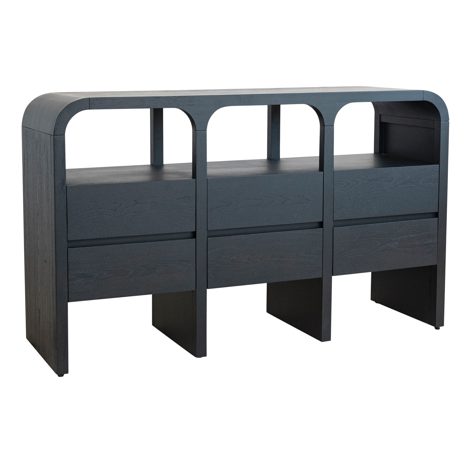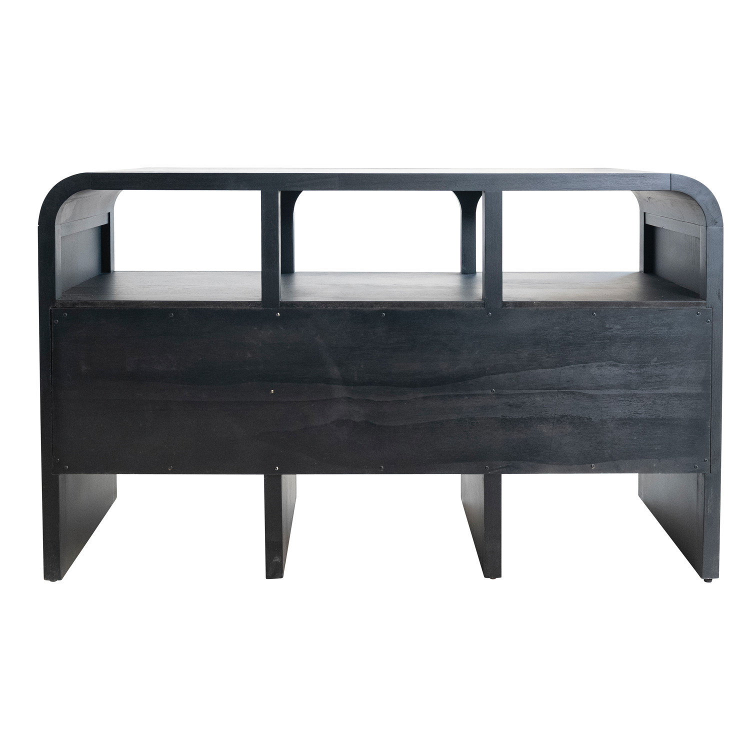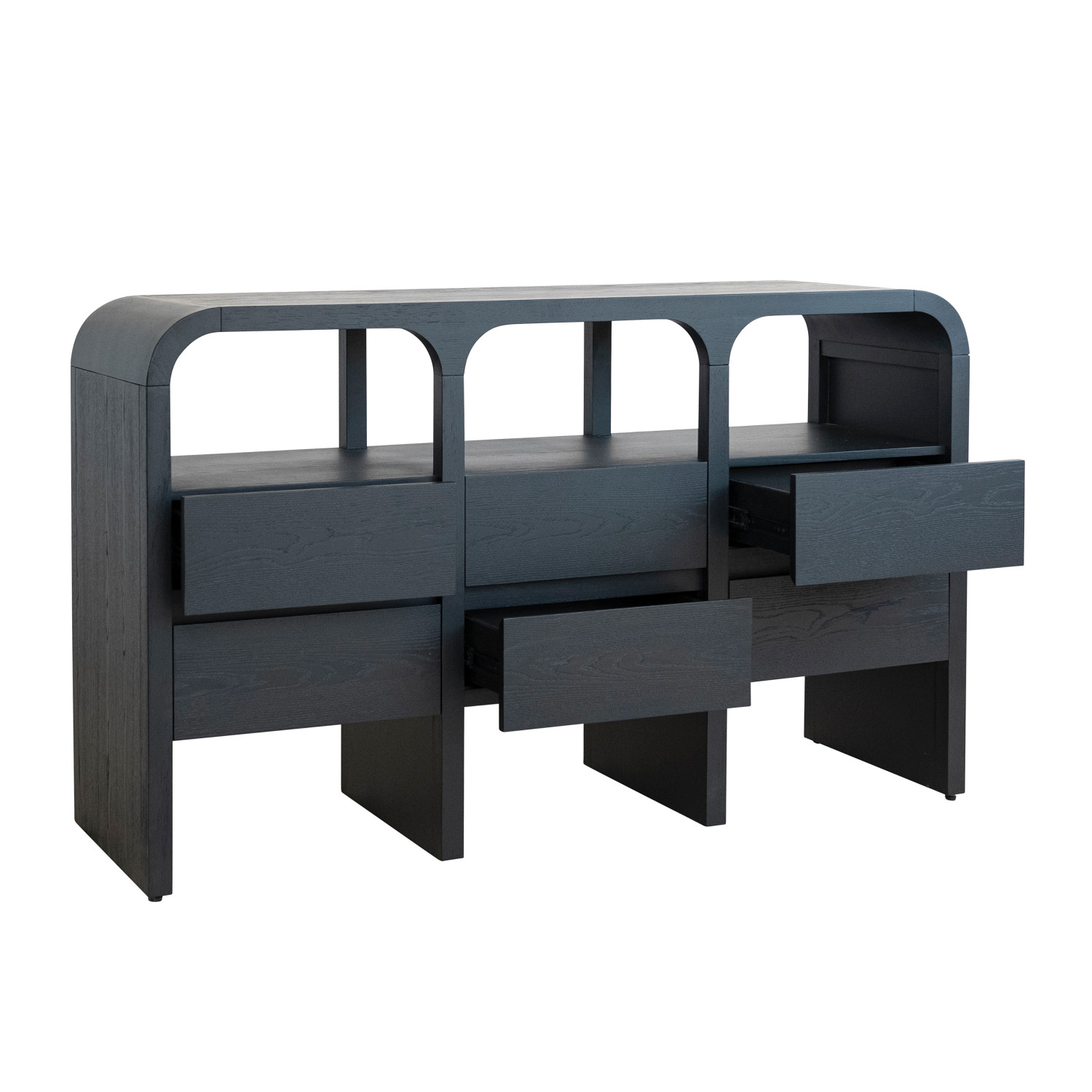 Catalog Name: 60"W x 19"D x 36"H Rubberwood & Oak Wood Veneer Console Table w/ 3 Shelves & 6 Drawers, Black, Truck Ship