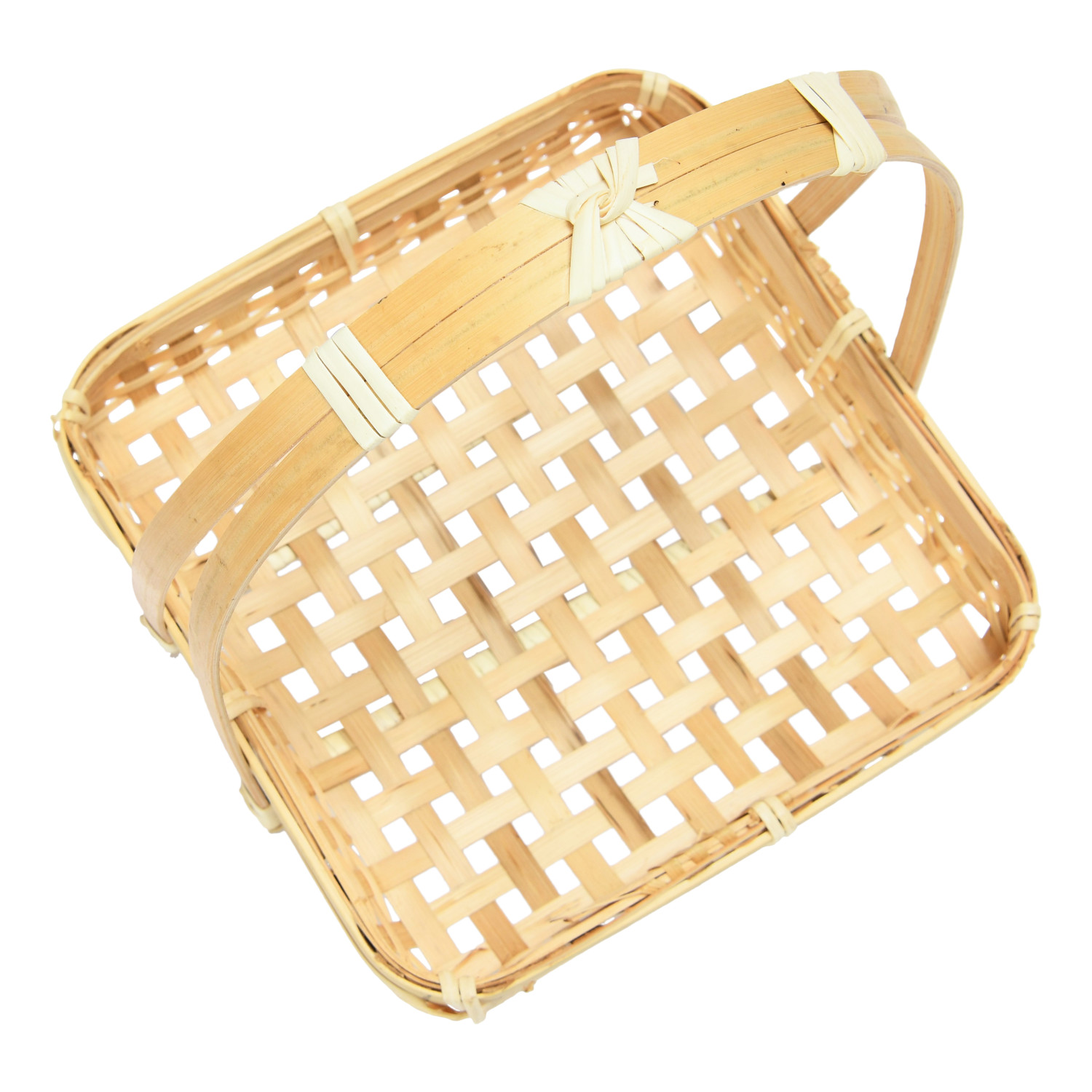 This contemporary boho stand with removable tray showcases organically hand-woven construction and a bold rounded handle. Hand-woven bamboo stand with handle and removable tray. Add a dash of boho charm to any living space with this stylishly versatile stand with tray. Arrange treasured trinkets or small plants for a delightfully eclectic display.