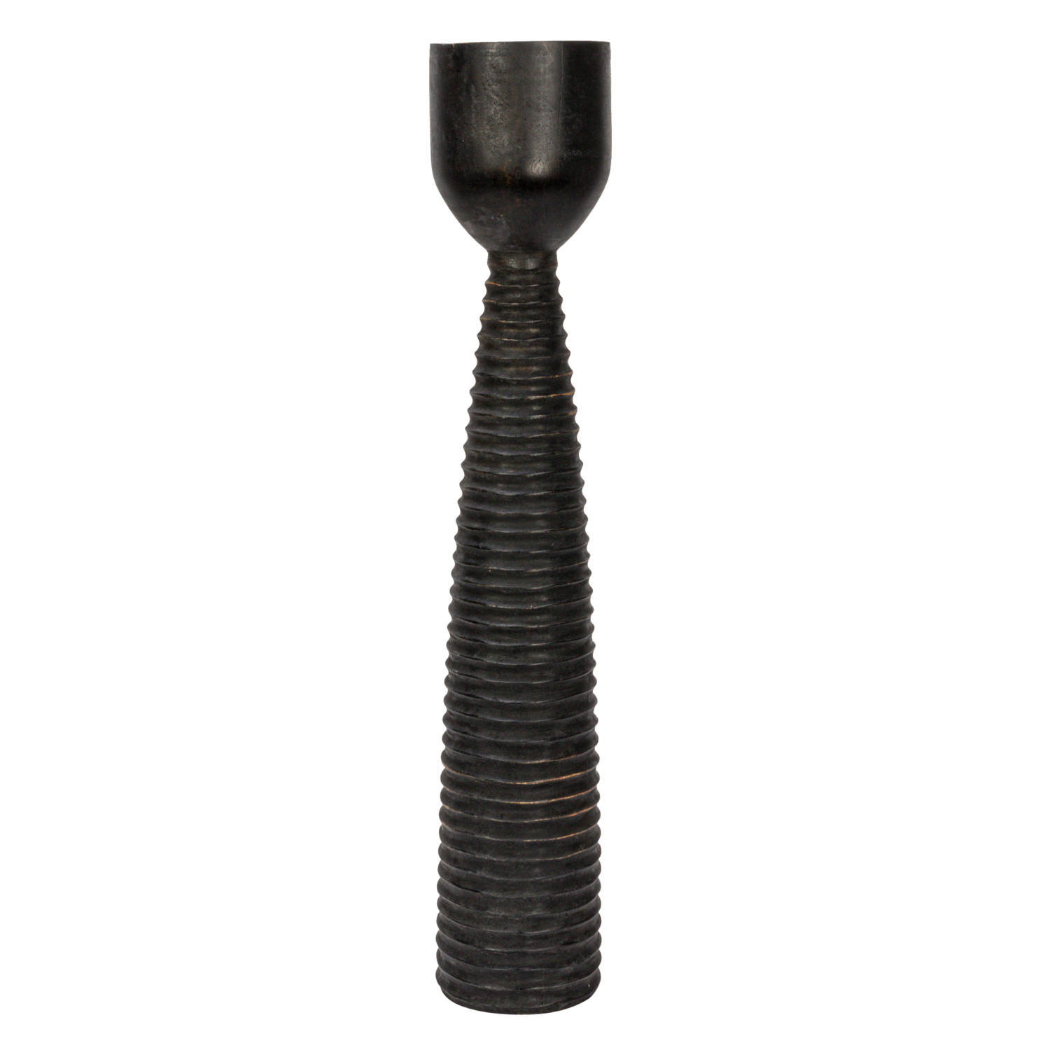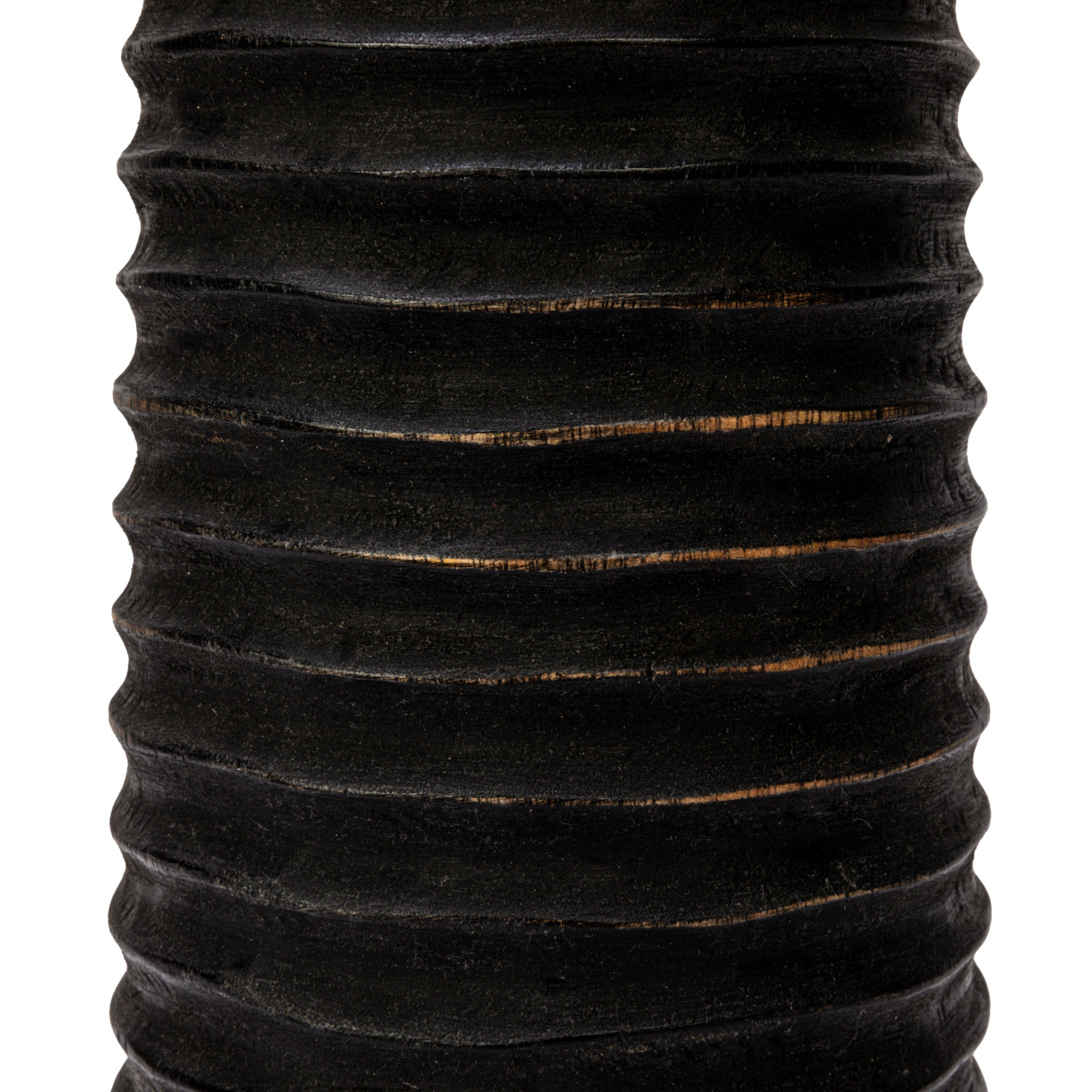 Illuminate the home with this black mango wood ribbed candle holder. This candle holder features a hand-carved mango wood construction that has a ribbed texture and a black finish. The mango wood material is pure and eco-friendly, as it comes from trees that are harvested after they stop producing fruit. The candle holder has a round base and a round top that can hold a 4-inch pillar candle (not included) creating a cozy and romantic atmosphere. It measures 5 inches in diameter and 20 inches in height. Whether used as a standalone piece or with a matching set, this candle holder will be a stunning accent for a table centerpiece, mantelpiece, or fireplace. A tall and slender candle holder with a hand-carved mango wood construction and a black finish. Suitable for any home decor style, especially rustic, dark, or timeless. Perfect for adding some height and elegance to a table centerpiece, a mantelpiece, or a fireplace. Made of pure mango wood.