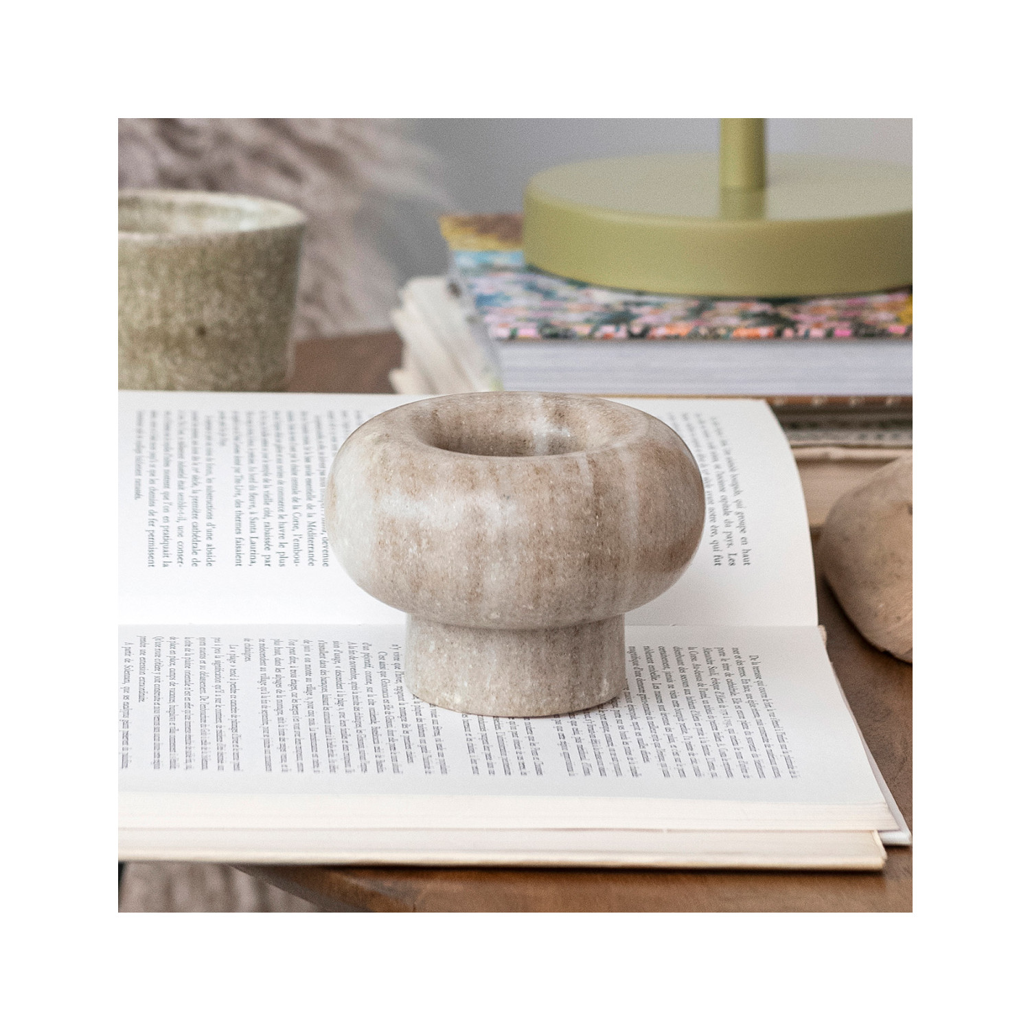 Enhance the home with this beige marble tealight holder. This candle holder features a pure marble construction that has a smooth and polished surface. The marble material has natural color variations that range from beige to white hues, creating a unique and elegant look. The candle holder has a round shape that can hold one standard tealight candle (not included) creating a cozy and romantic atmosphere. Measures 4 inches in diameter and 3 inches in height. Whether used as a standalone piece or with a matching set, this candle holder will be a stunning accent for the mantelpiece, dining table, or console table. A compact candle holder with a pure marble construction and a beige color. Suitable for any home decor style, especially marble-like, formal, or elegant. Perfect for adding some warmth and sophistication to a mantelpiece, a dining table, or a console table. Made of pure marble material that is durable and easy to clean.