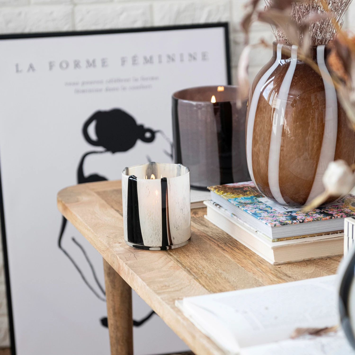 Catalog Name: 4" Round x 4"H Art Glass Striped Candle Holder/Vase, Cream Color & Black