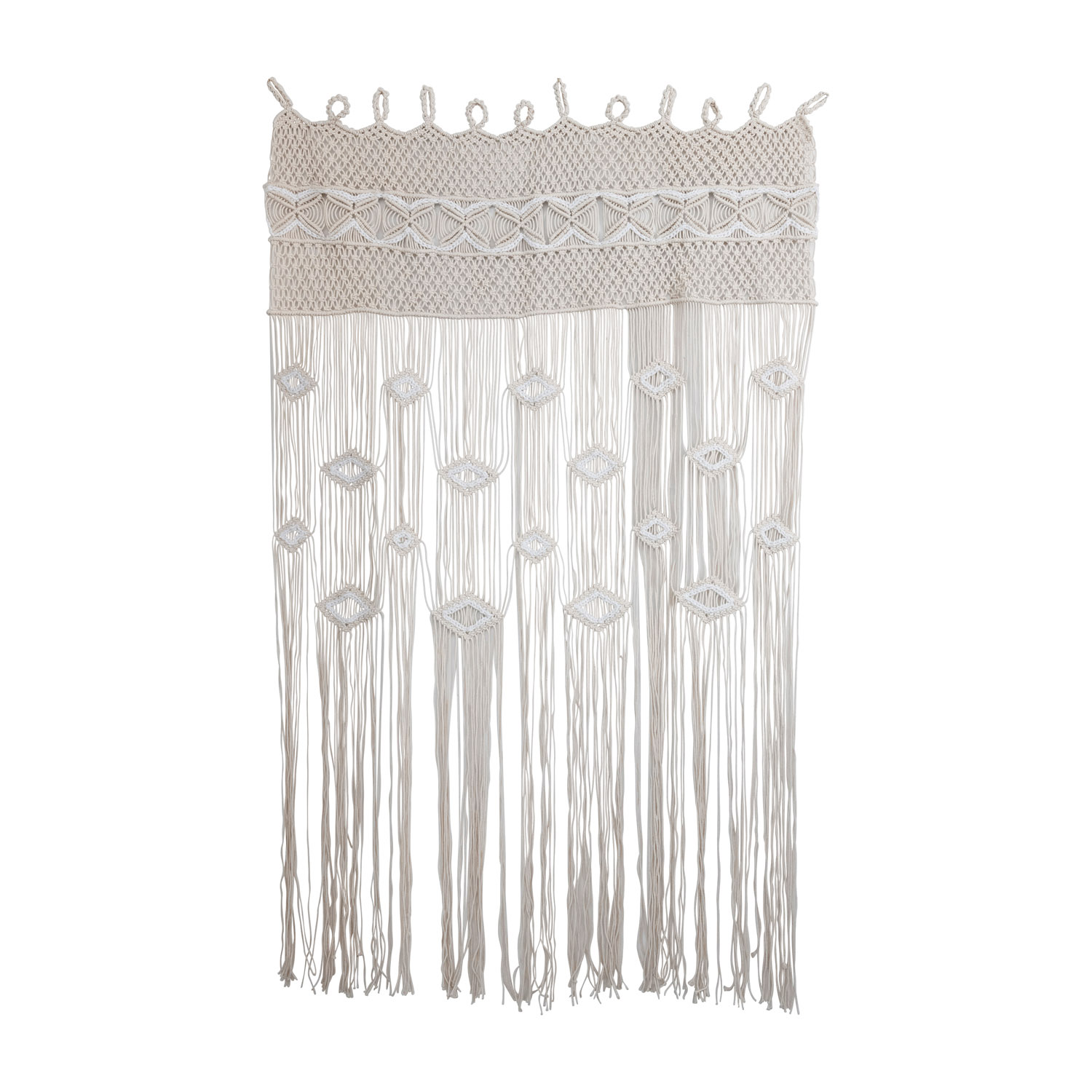 This boho-inspired curtain showcases intricate, cascading macramé cotton in various geometric designs. Hand-woven cotton blend macramé curtain in natural and white. Display as a stylish curtain alternative, doorway decoration, or woven wall hanging. Spot clean only.