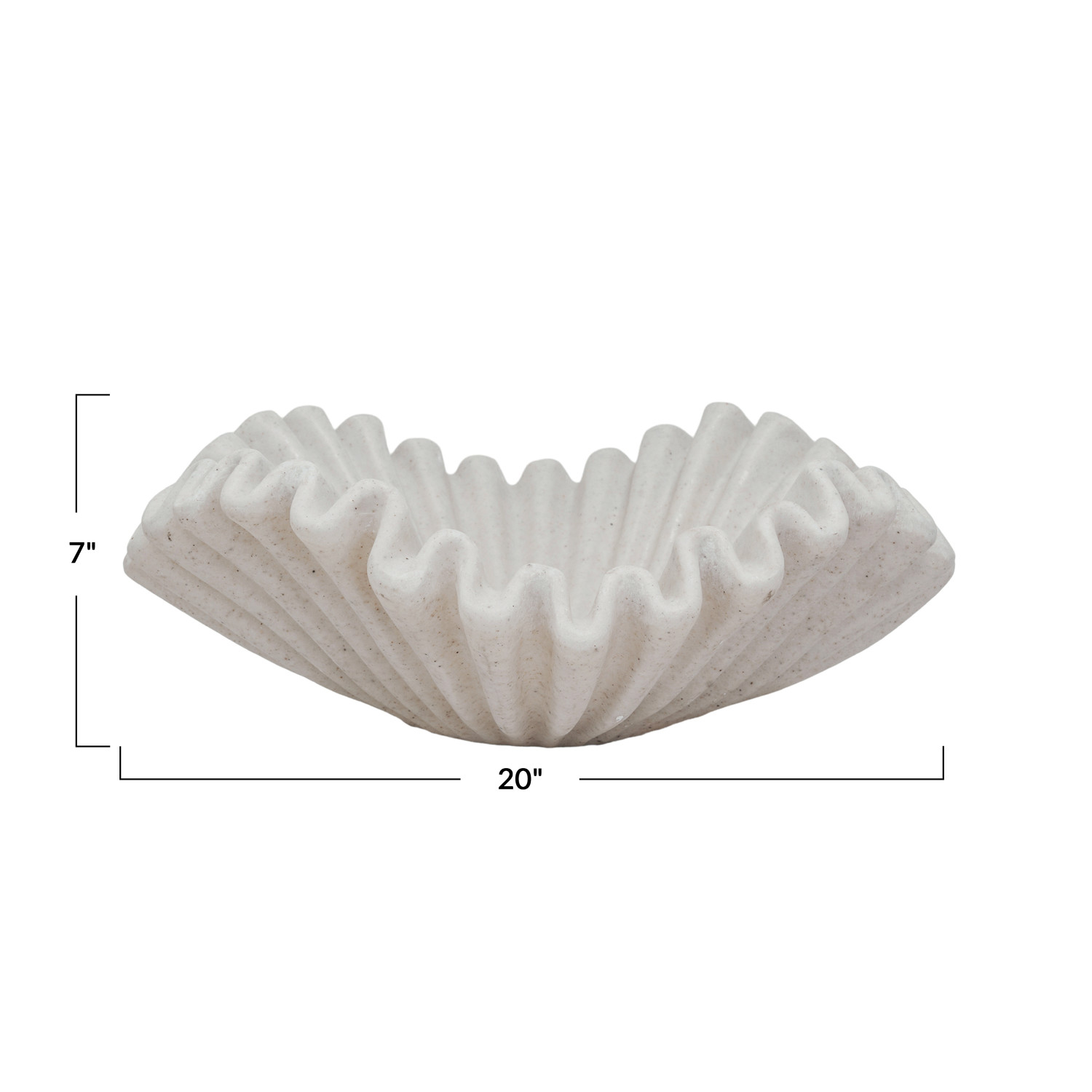 This Chic Ruffle Stone-Finish Bowl is an exquisite work of art, designed to captivate and enhance any space it occupies. At 20 inches square and 7 inches tall, its generous dimensions are matched by its visual impact. The cream color, reminiscent of natural stone, brings a serene and sophisticated vibe, while the ruffled edges add a dynamic and modern twist. Whether used to display fruit, decorative spheres, or simply as a standalone piece, this bowl is a testament to refined taste and an eye for contemporary design. It's not just a bowl; it's a statement piece that speaks volumes about any style.