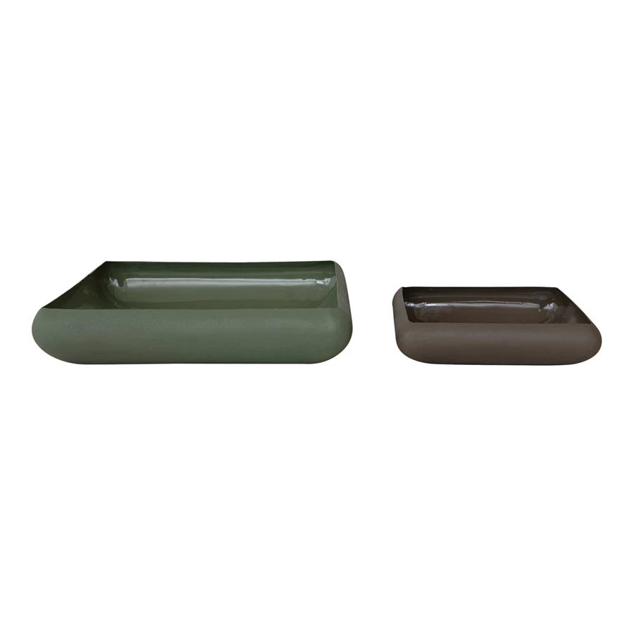 Catalog Name: 13-1/2" Square x 2-3/4"H & 8-1/2" Square x 2"H Decorative Enameled Metal Trays, Sand Finish, Olive Color & Brown, Set of 2