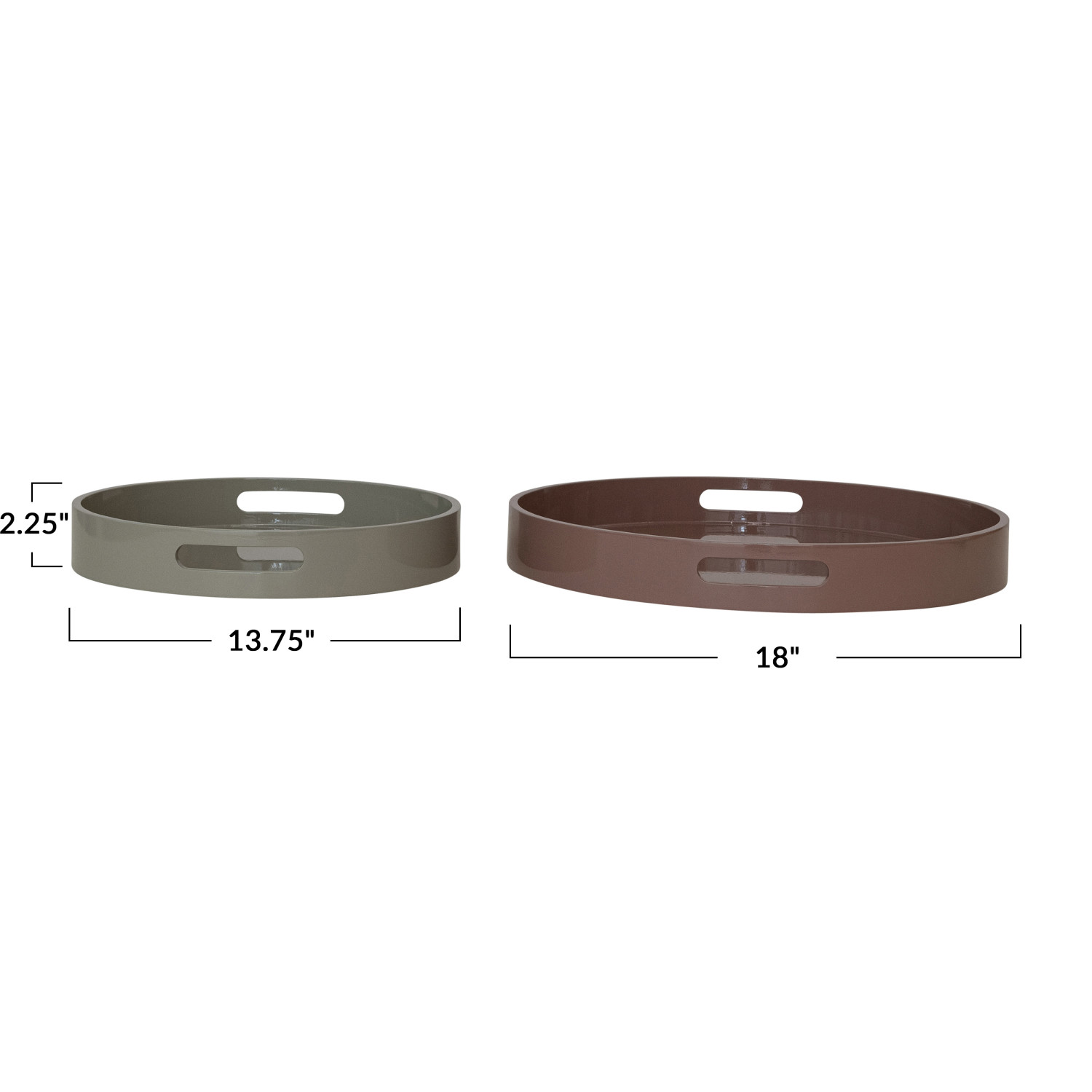 Catalog Name: 18" Round x 2-1/4"H & 13-3/4" Round x 2-1/4"H MDF Lacquered Trays w/ Handles, Brown & Taupe, Set of 2