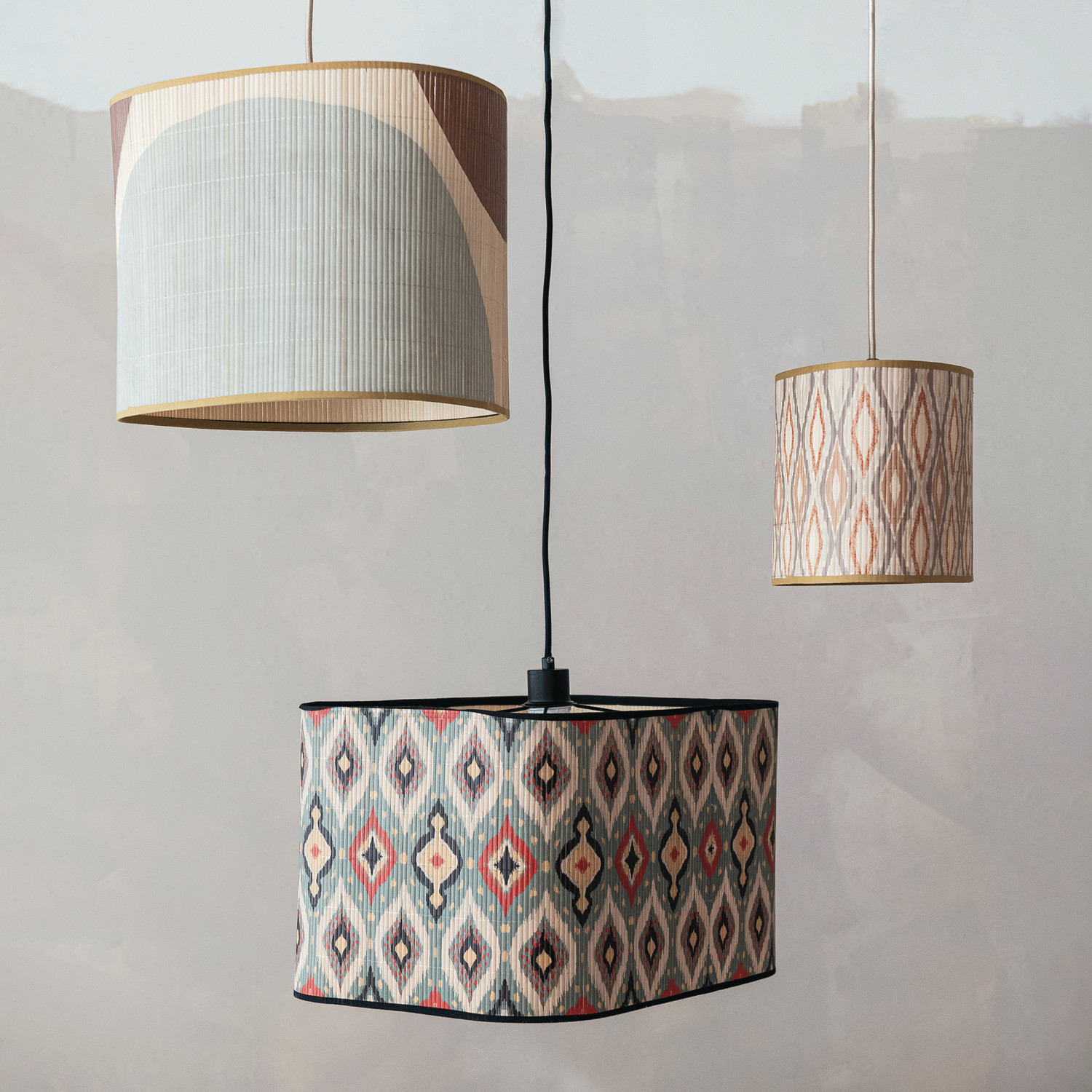 Catalog Name: 20-3/4"L x 13-3/4"W x 12"H Bamboo Organic Shaped Pendant Lamp w/ Printed Ikat Pattern, 8' Fabric Cord, Multi Color (Hardwire Only)