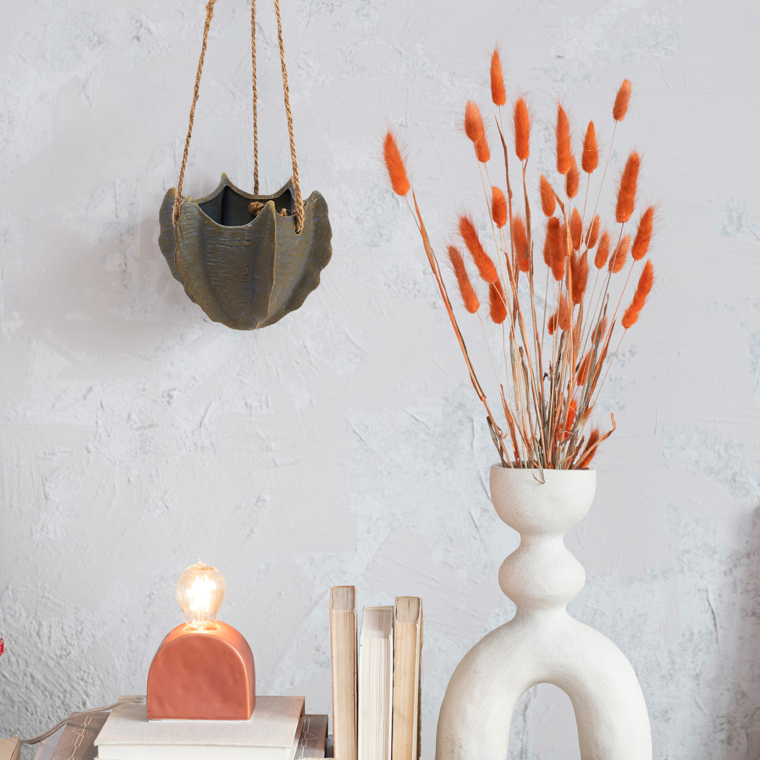 Mix and match our carefully curated collection of standing, wall mount, and decorative pots and planters. Explore a vast array of textures, hues, and silhouettes to create a personalized indoor jungle, including planters on stands, wall buckets, oversized pots, hanging planters, figurine planters, window boxes, footed pots, and so much more. Choose from a wide array of materials from stoneware and ceramic to metal and glass, and styles from contemporary boho and classic farmhouse to mid-century modern and vintage glam. Showcase lovingly grown herbs and greenery inside pieces from this artfully crafted collection, or simply use as a stylish cover for low-maintenance faux flora. This modern stoneware planter showcases the silhouette of a cactus suspended from a woven rope. Display in a living space of any style from modern to coastal. Not equipped with drainage holes. Made from stoneware and jute.