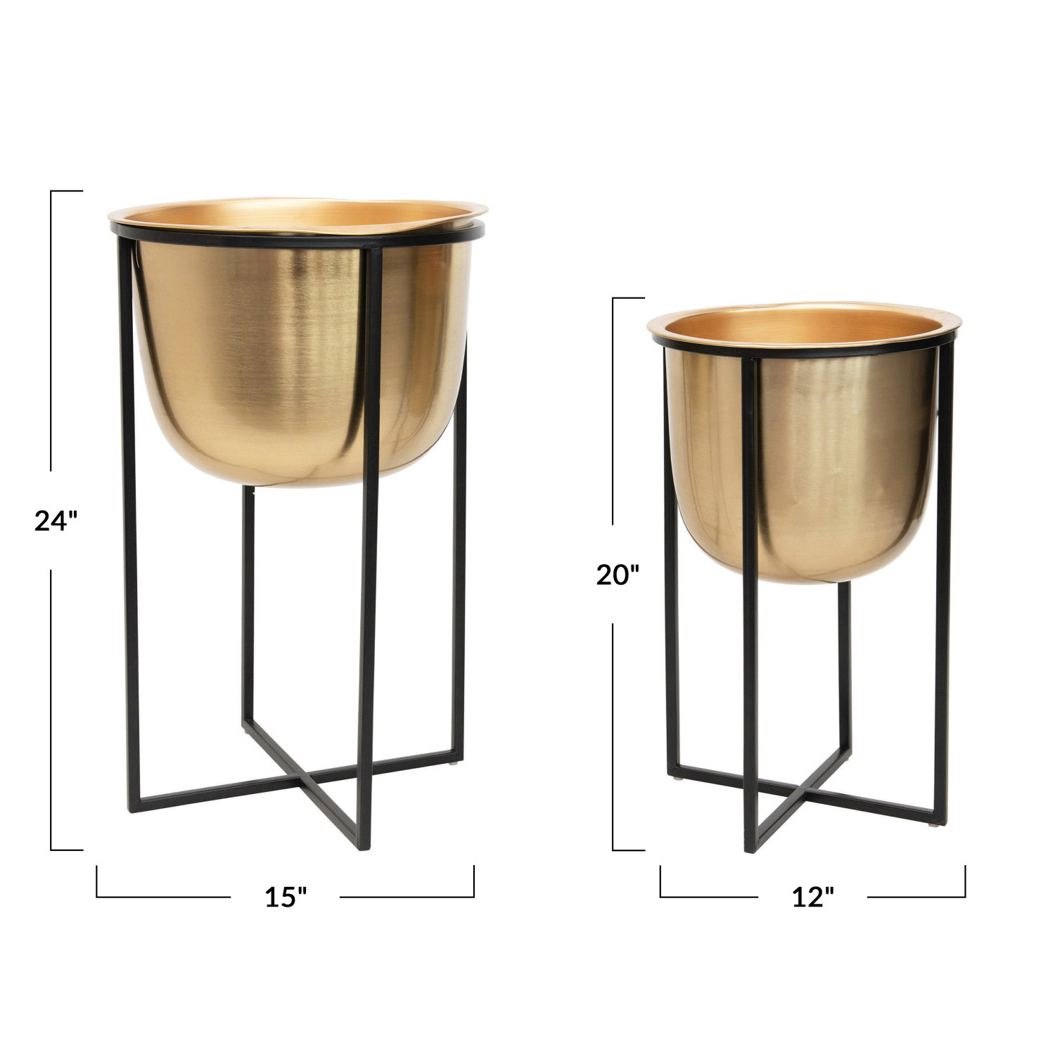 These modern and stylish metal planters with black stands have a brushed gold finish and come in a handsome set of two. This pair is a trendy accent for any room in the home or office and complements many design themes. Varying heights add interest; this set is perfect for adding a touch of greenery.