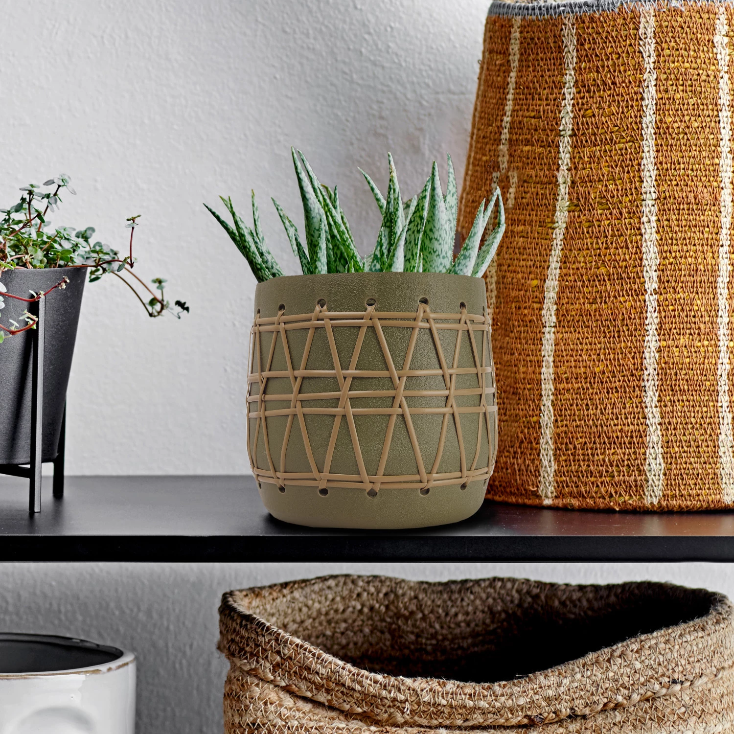 Mix and match our carefully curated collection of standing, wall mount, and decorative pots and planters. Explore a vast array of textures, hues, and silhouettes to create a personalized indoor jungle, including planters on stands, wall buckets, oversized pots, hanging planters, figurine planters, window boxes, footed pots, and so much more. Choose from a wide array of materials from stoneware and ceramic to metal and glass, and styles from contemporary boho and classic farmhouse to mid-century modern and vintage glam. Showcase lovingly grown herbs and greenery inside pieces from this artfully crafted collection, or simply use as a stylish cover for low-maintenance faux flora. This Scandinavian-inspired planter features stoneware construction with contrasting woven detail. Display in a living space of any style from Scandinavian to boho. Fill with dried seasonal flora, decorative branches, or simply display as a standalone accent. Made from stoneware and plastic.