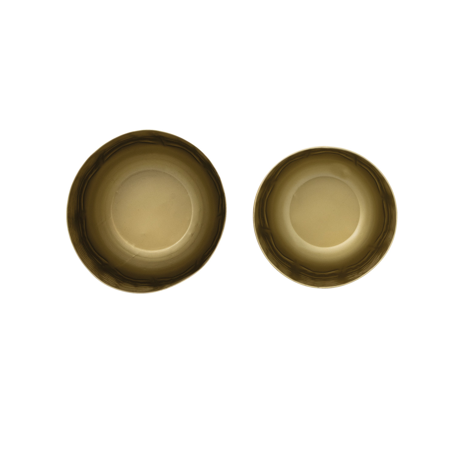 Catalog Name: 9-1/4" Round x 8-3/4"H & 8-1/4" Round x 7-1/4"H Debossed Metal Planters, Antique Brass Finish, Set of 2 (Holds 6" & 4" Pots)
