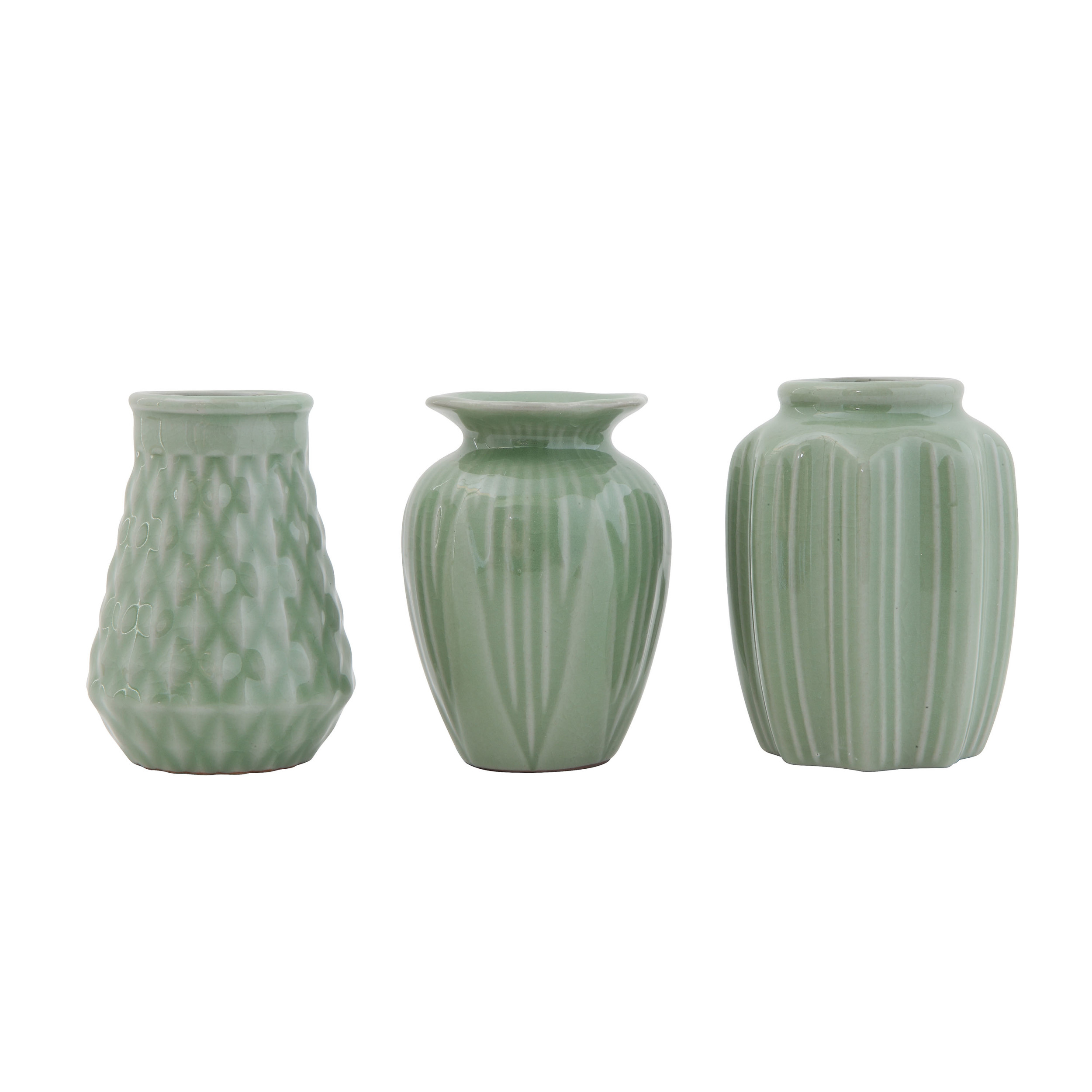 Catalog Name: 3" Round x 4"H & 2-3/4" Round x 4"H Stoneware Vases, Jade Crackle Glaze, Set of 3 (Each One Will Vary)