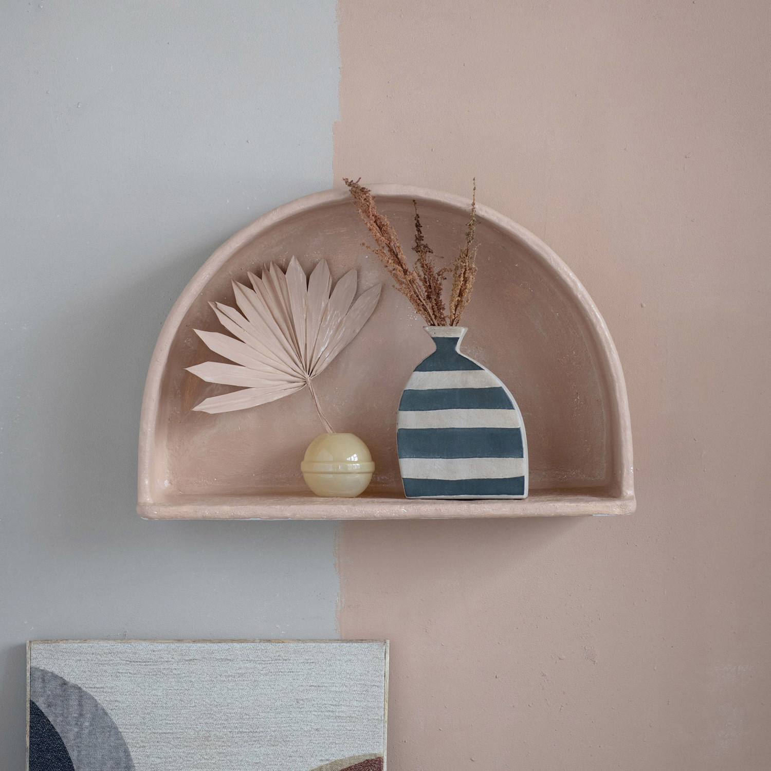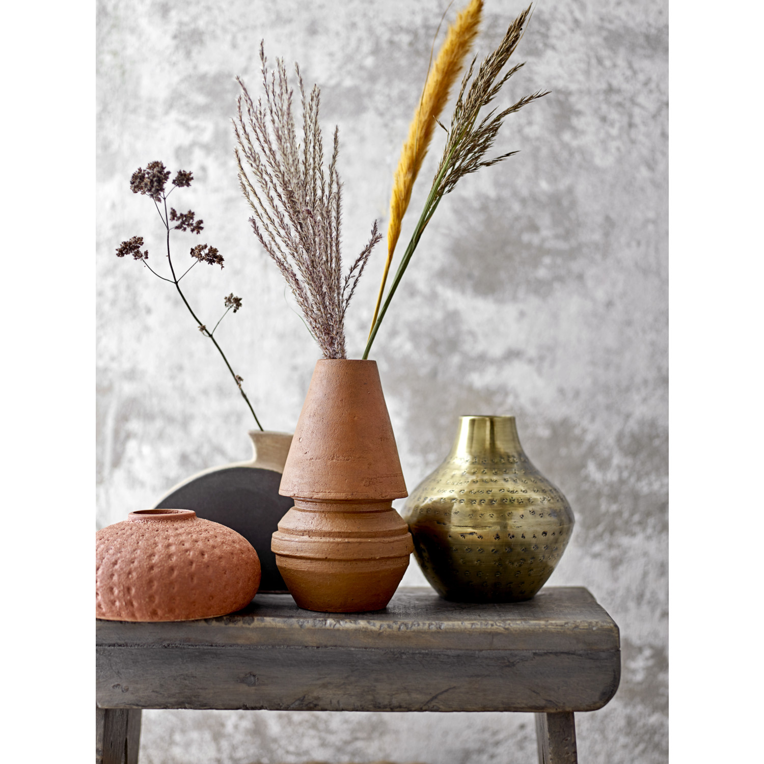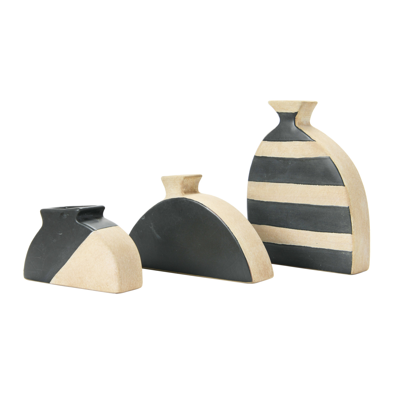 These artfully designed terra-cotta vases come in a stylish set of three. This set is an alluring and uniquely shaped accent that will be a wonderful accent for a living room, dining room, kitchen, bedroom, or office and will complement a modern or eclectic vibe.