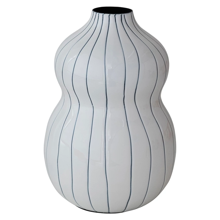Catalog Name: 5-1/2" Round x 9"H Enameled Metal Organic Striped Vase, White & Blue