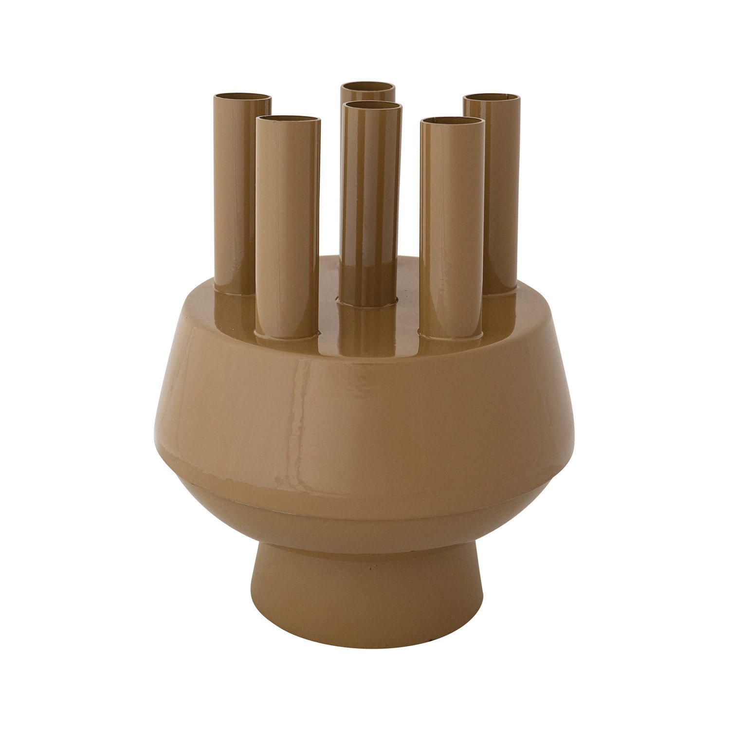 Catalog Name: 6-1/2" Round x 7-3/4"H Enameled Metal Footed Multi-Stem Flower Vase w/ Removable Frog Lid & 6 Openings, Camel Color