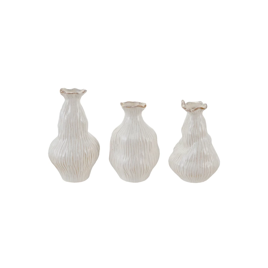 Catalog Name: 4-3/4"H - 5-3/4"H Textured Stoneware Organic Shaped Vase, Reactive Glaze, White, 3 Styles (Each One Will Vary)