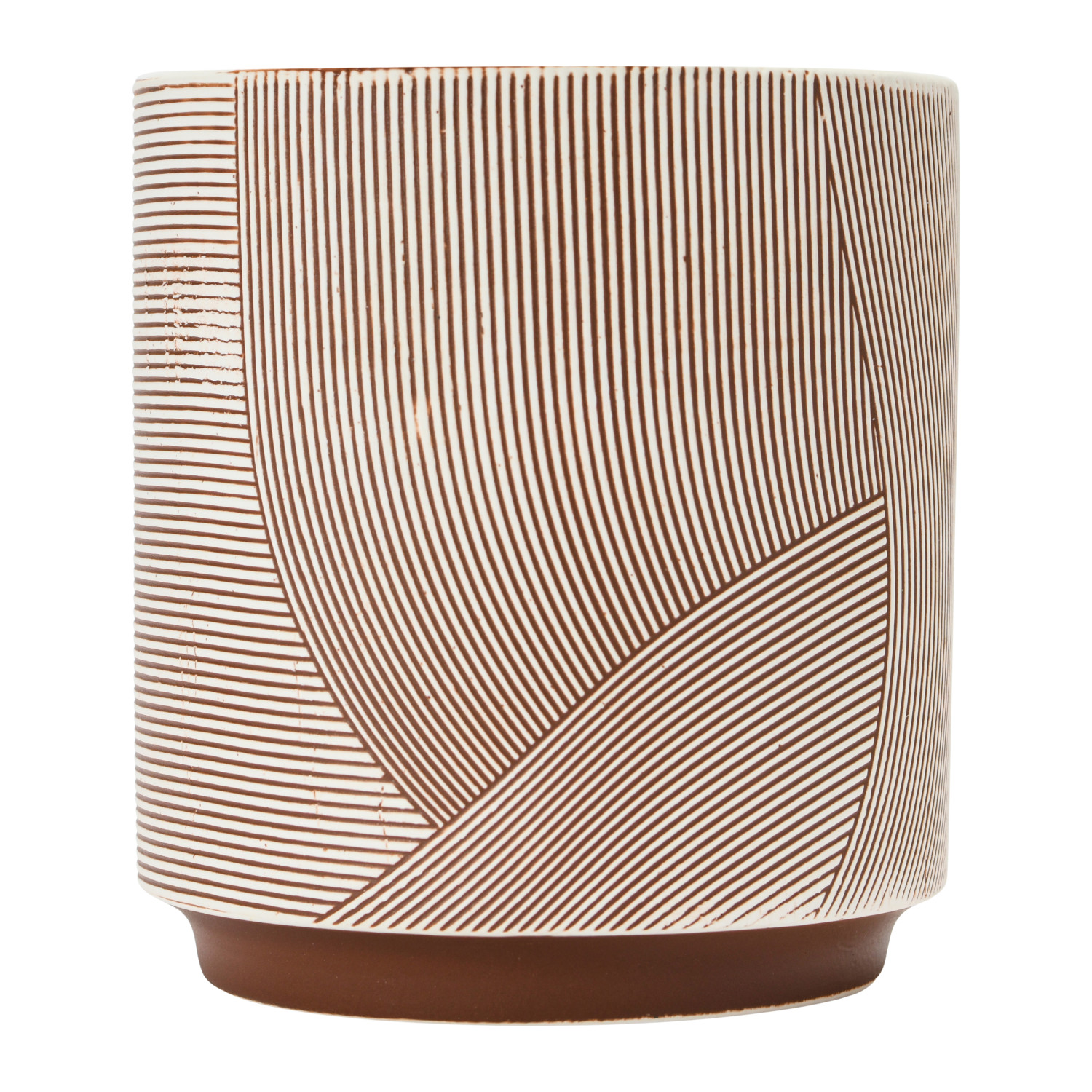 A modern and artistic stoneware planter that features a textured surface and a brown and cream color scheme. Ideal for adding some style and personality to the indoor or outdoor plants. Durable and easy-to-clean planter with textured finish and no drainage holes, holds a 4-inch pot and can be wiped clean with a dry cloth. Made of stoneware.