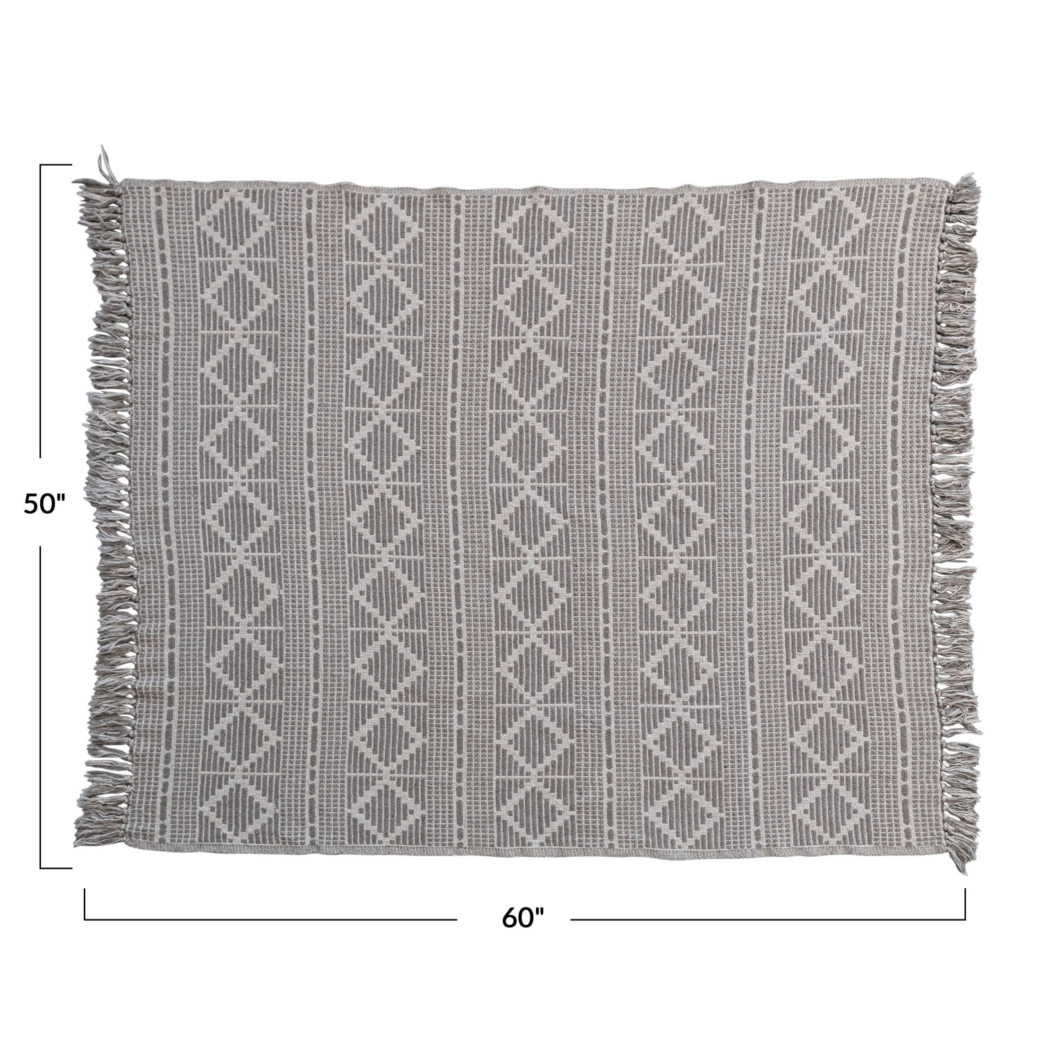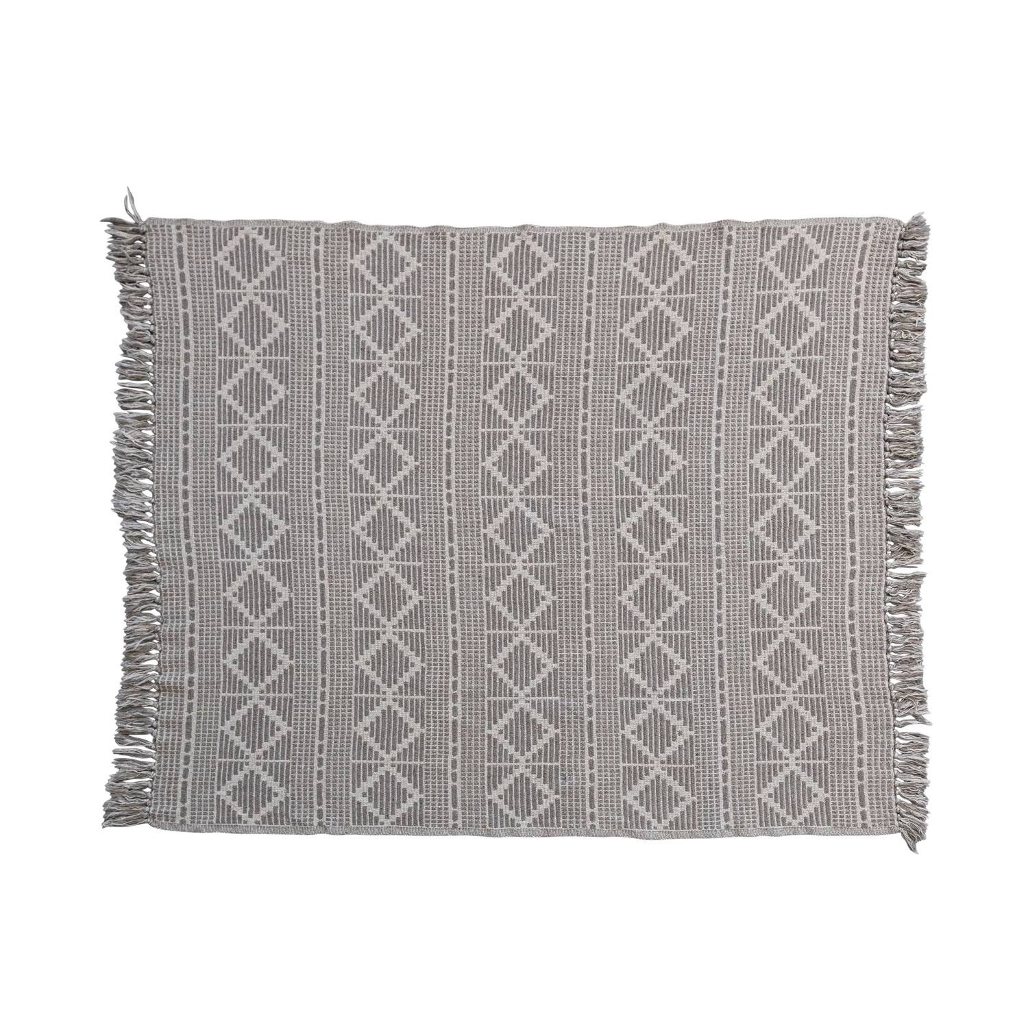 Enhance the home with this reclaimed cotton jacquard throw with a diamond pattern and fringe in grey and natural. This throw blanket features a reclaimed cotton jacquard that creates a soft and smooth feel. The diamond pattern adds some contrast and interest to the simple design. The elegant and geometric pattern gives the throw a transitional and sophisticated look. The fringe adds some texture and flair to the edges of the throw. The grey and natural color is neutral and elegant and can blend with any color scheme or theme. This throw blanket is ideal for displaying in a living space of any style, from Scandinavian to farmhouse. Use it to decorate the sofa, bed, chair, or bench. The throw blanket measures 60 inches long by 50 inches wide, a versatile size for draping or covering. To keep it clean and fresh, just machine wash warm, gentle cycle, do not bleach, tumble dry low, warm iron if needed, or hand wash. This throw is a soft and elegant piece that will make the home more comfortable and stylish. A soft and elegant throw blanket with a reclaimed cotton jacquard and a diamond pattern. Ideal for displaying in a living space of any style, from Scandinavian to farmhouse. Machine wash warm gentle cycle, do not bleach, tumble dry low, warm iron if needed, or hand wash. Made of cotton and polyester.