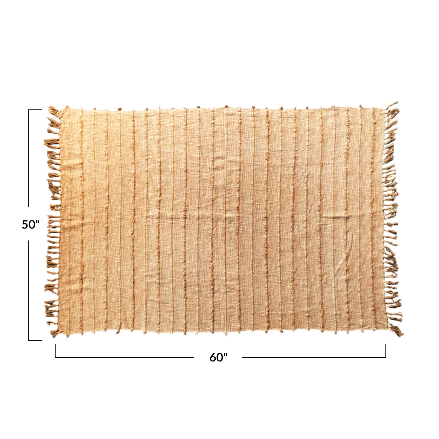 Catalog Name: 60"L x 50"W Stonewashed Woven Cotton Slub Throw w/ Tufted Stripes & Fringe, Beige
