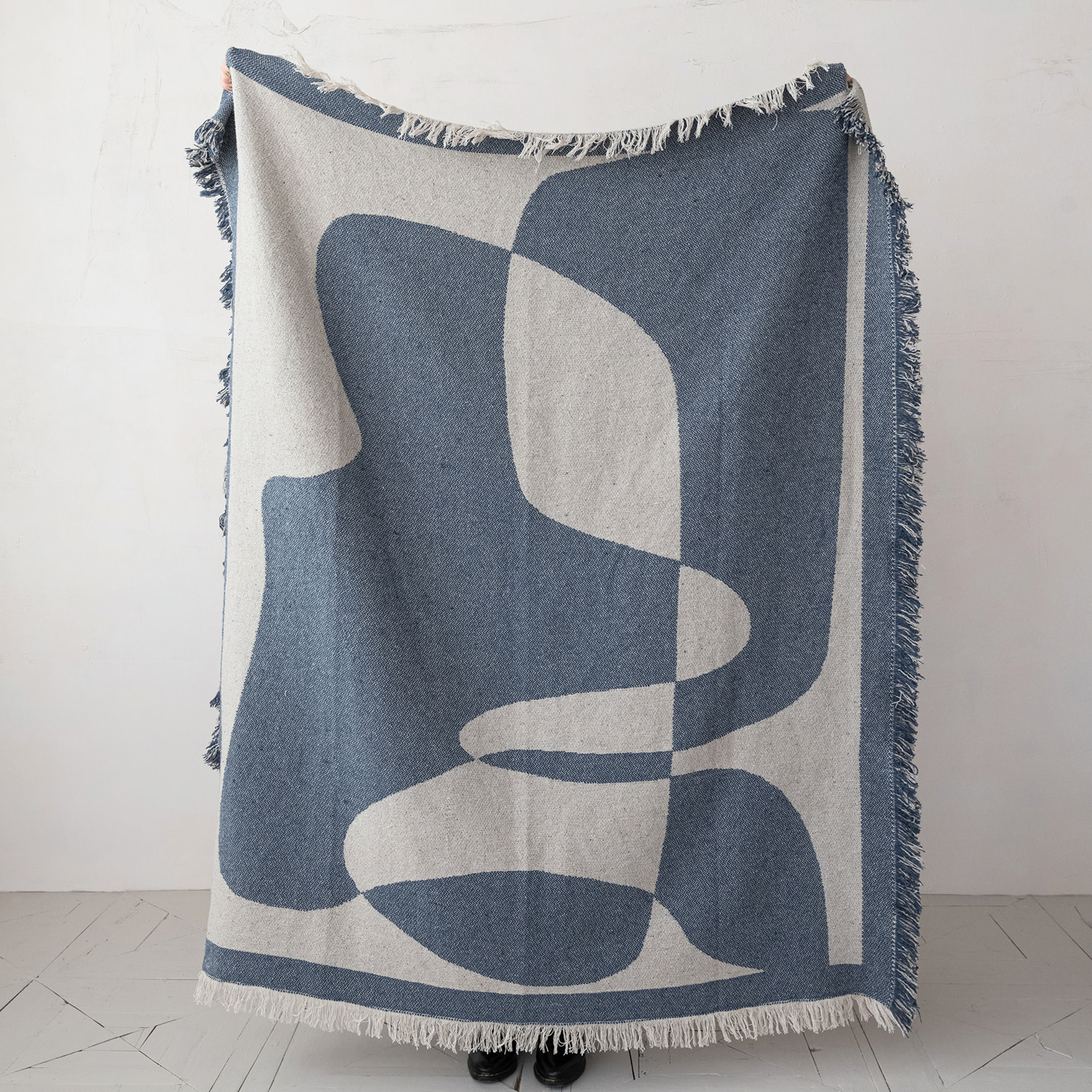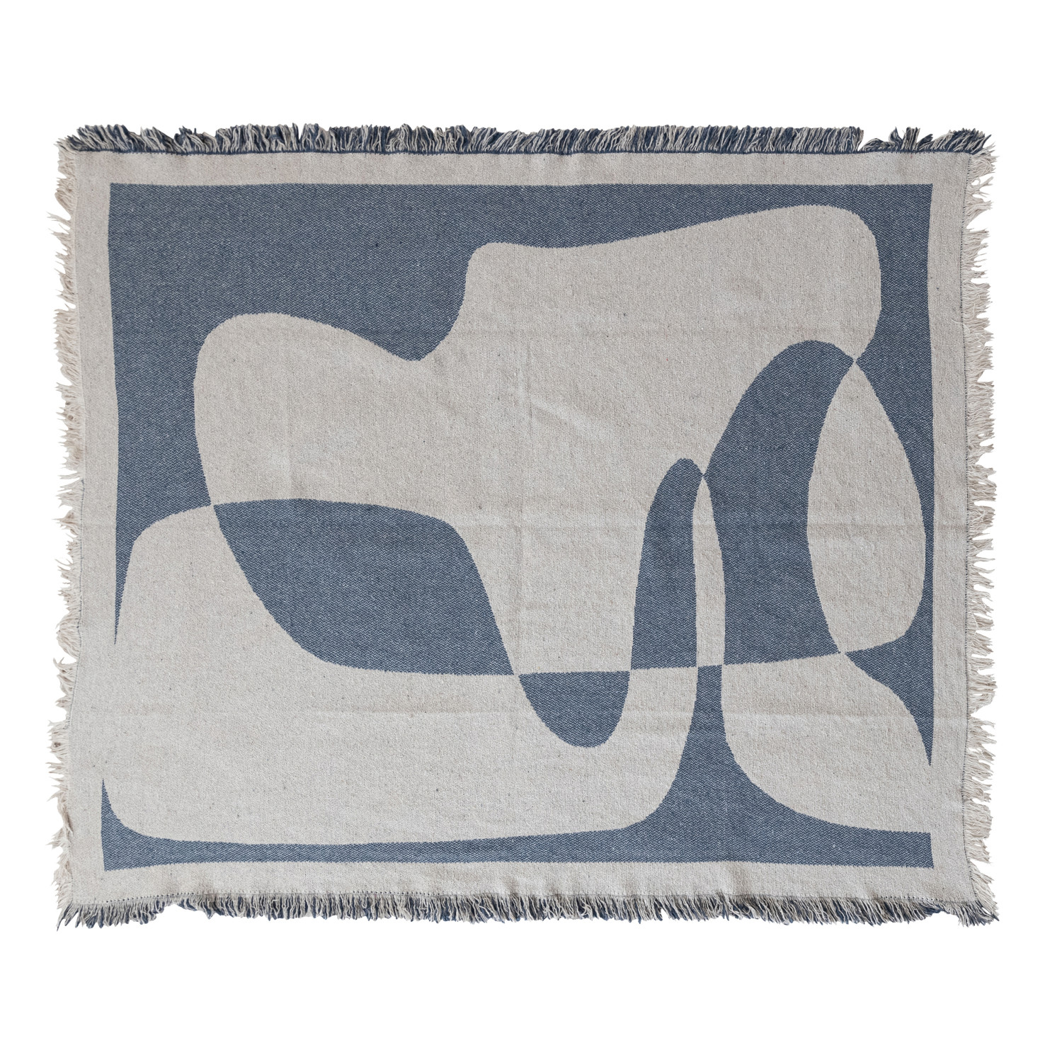 Catalog Name: 60"L x 50"W Woven Recycled Cotton Blend Jacquard Throw w/ Abstract Design & Eyelash Fringe, Natural & Blue