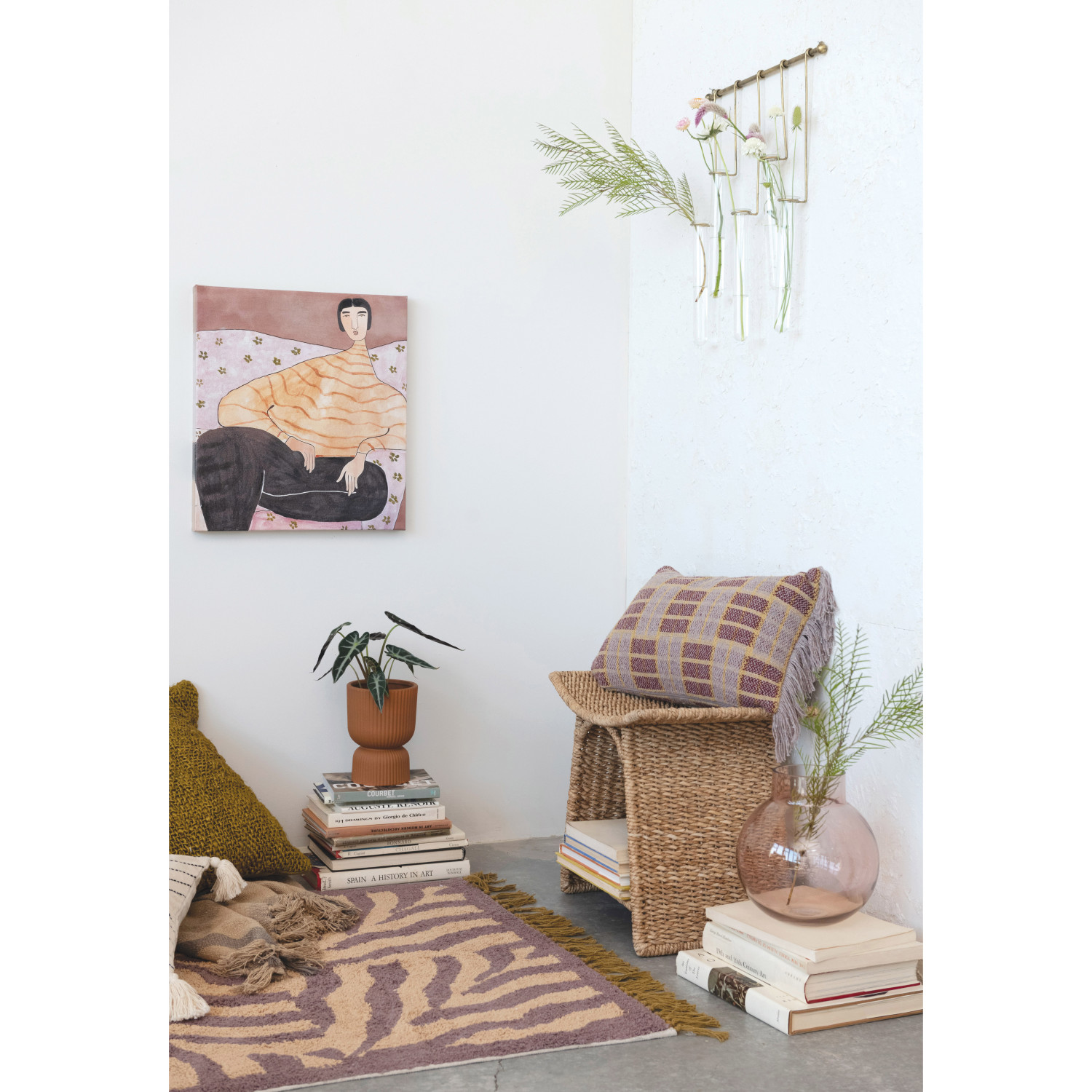 This contemporary take on a traditionally styled lumbar pillow features intricately woven recycled cotton with a plaid print, finished with decorative fringe. Purple and Dijon recycled cotton throw pillow with plaid pattern and fringe. Express your constantly evolving style with the simple addition of this eye-catching pillow. Removable cotton pillow cover and insert; Machine wash cold, gentle cycle, do not bleach, tumble dry low; Warm iron if needed.