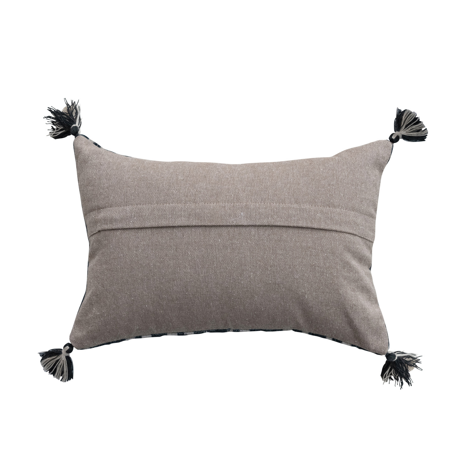 Cotton Velvet Ikat Printed Lumbar Pillow w/ Tassels & Chambray Back, Navy Color & Natural
