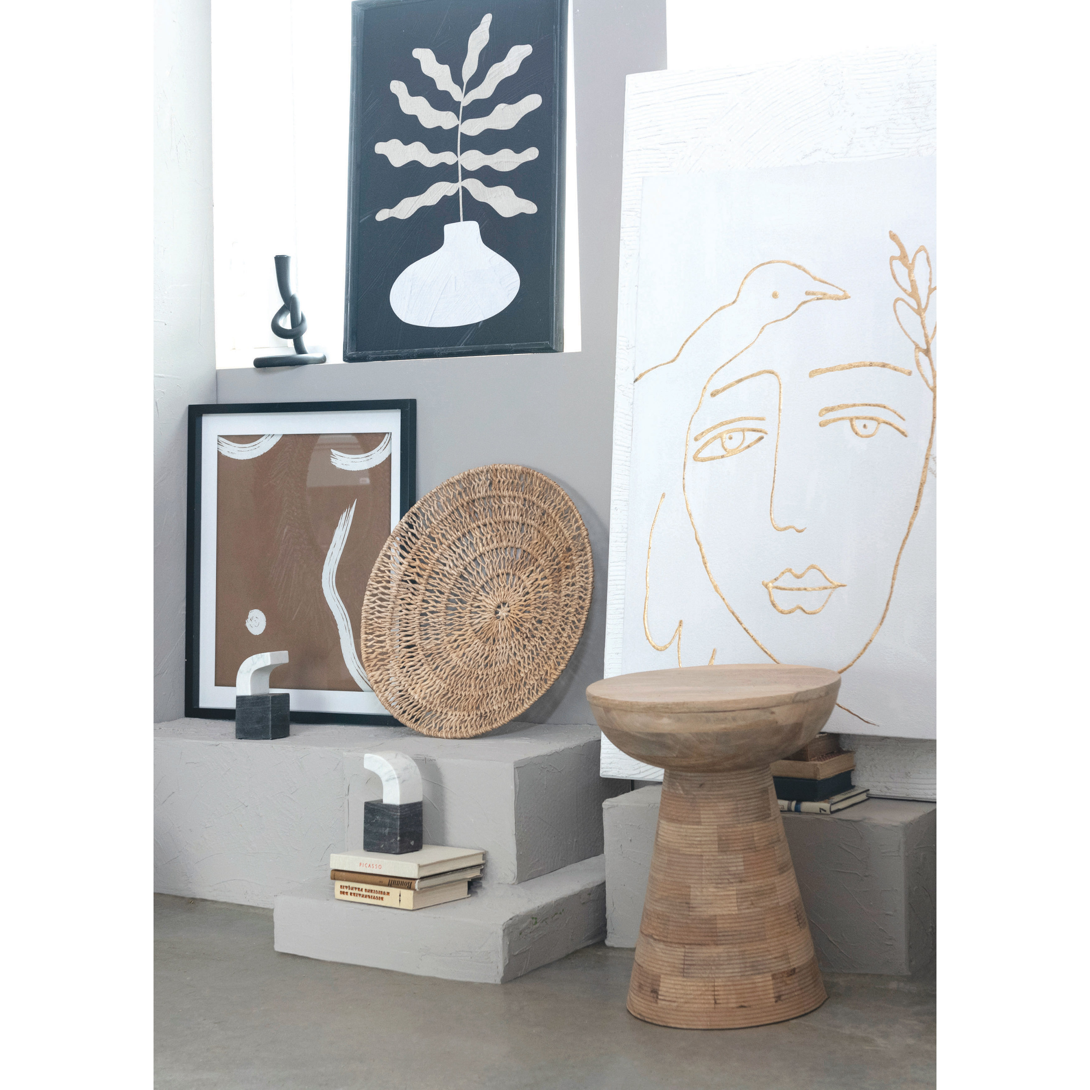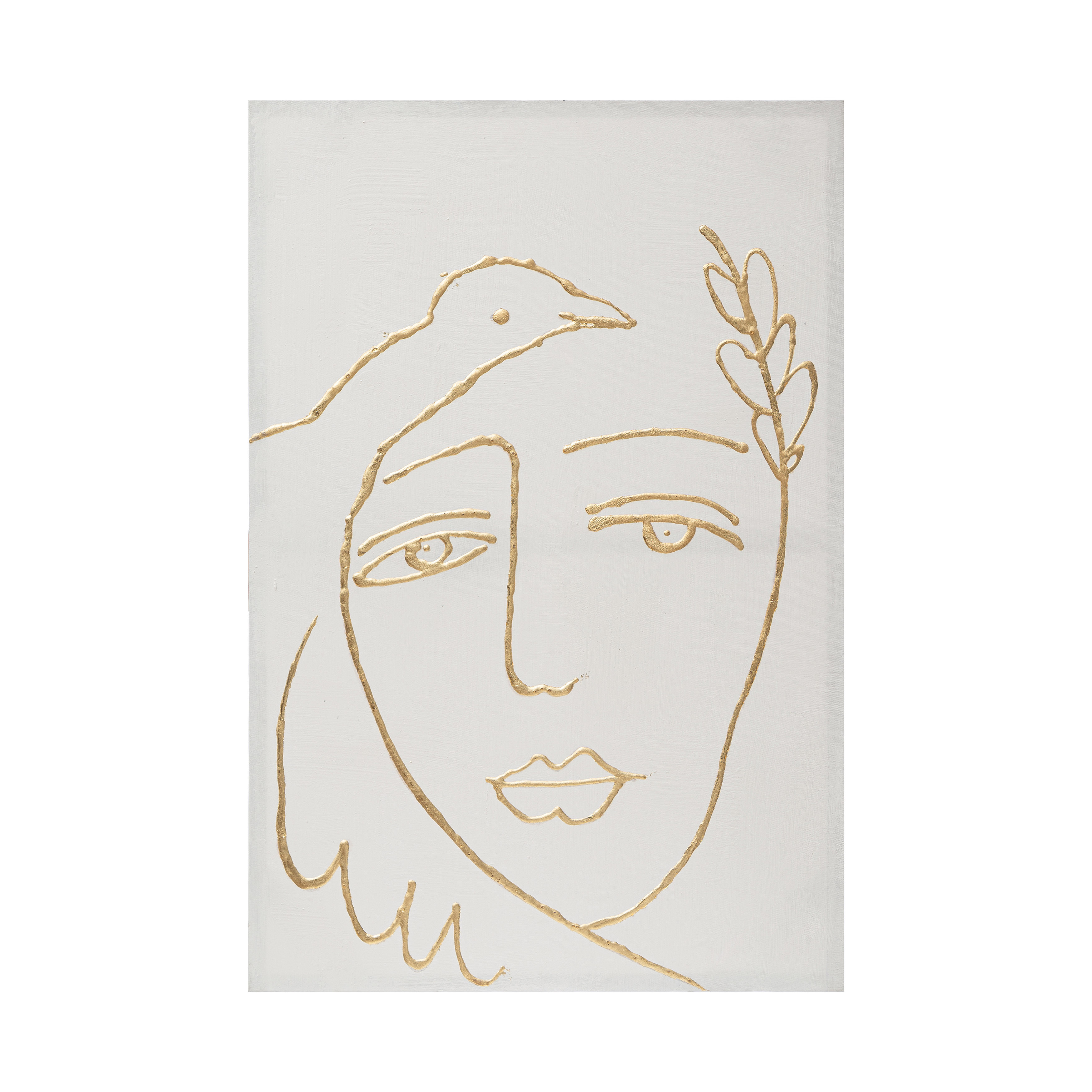 This romantic piece of wall art showcases a hand-painted, abstract design of a serene visage and bird on canvas. Gold, hand-painted abstract face and bird on white canvas. Display this stunning wall decor to effortlessly enhance the design of any living space. Made from pine wood, canvas, and acrylic.