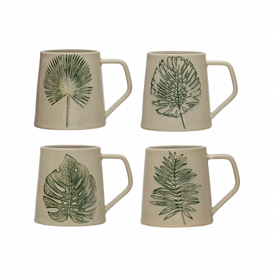 14 oz. Stoneware Mug with Debossed Leaf, Reactive Crackle Glaze, 4 Styles