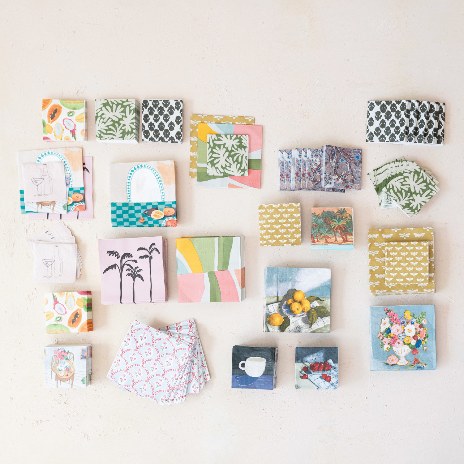 This set of 50 paper napkins with palm trees in white and black is a stylish and eco-friendly addition to any table setting. The disposable, biodegradable, and easy-to-clean napkin is perfect for serving snacks, drinks, or desserts, and can be used as a decorative item or a gift. It can suit various decor styles, such as modern, tropical, boho, or cottagecore, and create a cozy beautiful and nature atmosphere. The napkin measures 6.5 inches in length and width when folded in half. This is a beautiful and fun piece that will add some beauty and freshness to the table setting.