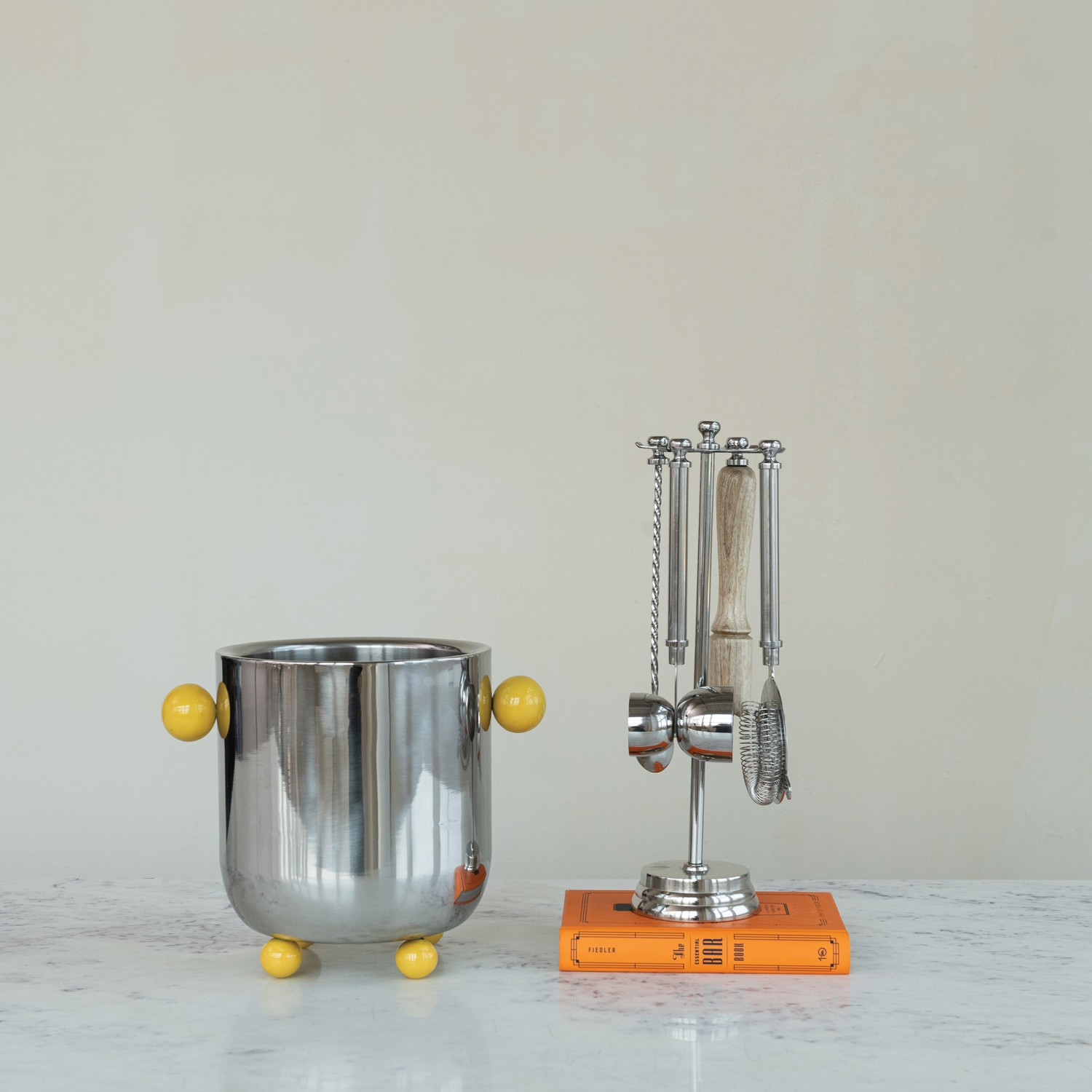 Catalog Name: 7-1/2"L - 9-1/2"L Stainless Steel & Mango Wood Bar Tools w/ 13"H Stand, Nickel Finish & Natural, Set of 5