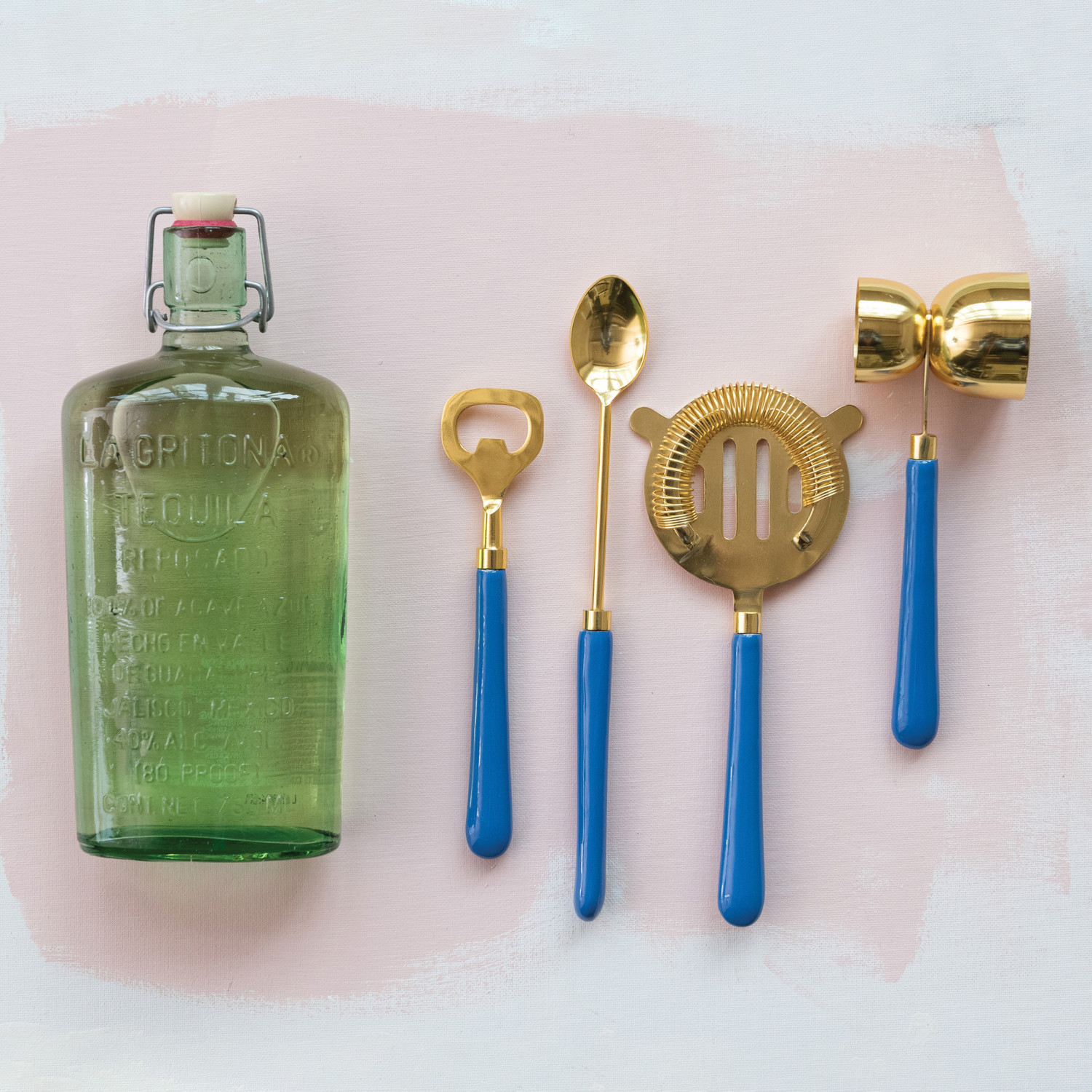 Catalog Name: 7-1/4"L - 10-1/4"L Stainless Steel & Aluminum Bar Tools w/ Enameled Handles, Gold Finish & Blue, Set of 4