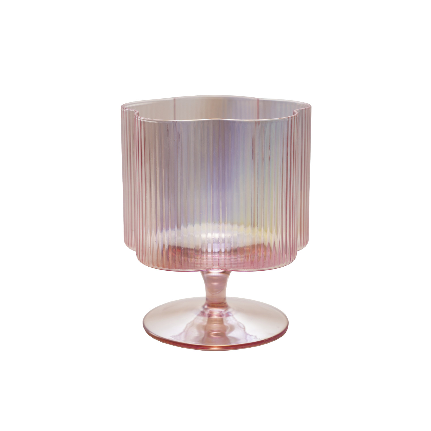 Catalog Name: 3-1/2" Round x 4-1/4"H 12 oz. Hand-Blown Pleated Flower Shaped Stemmed Wine Glass, Iridescent Finish, Pink