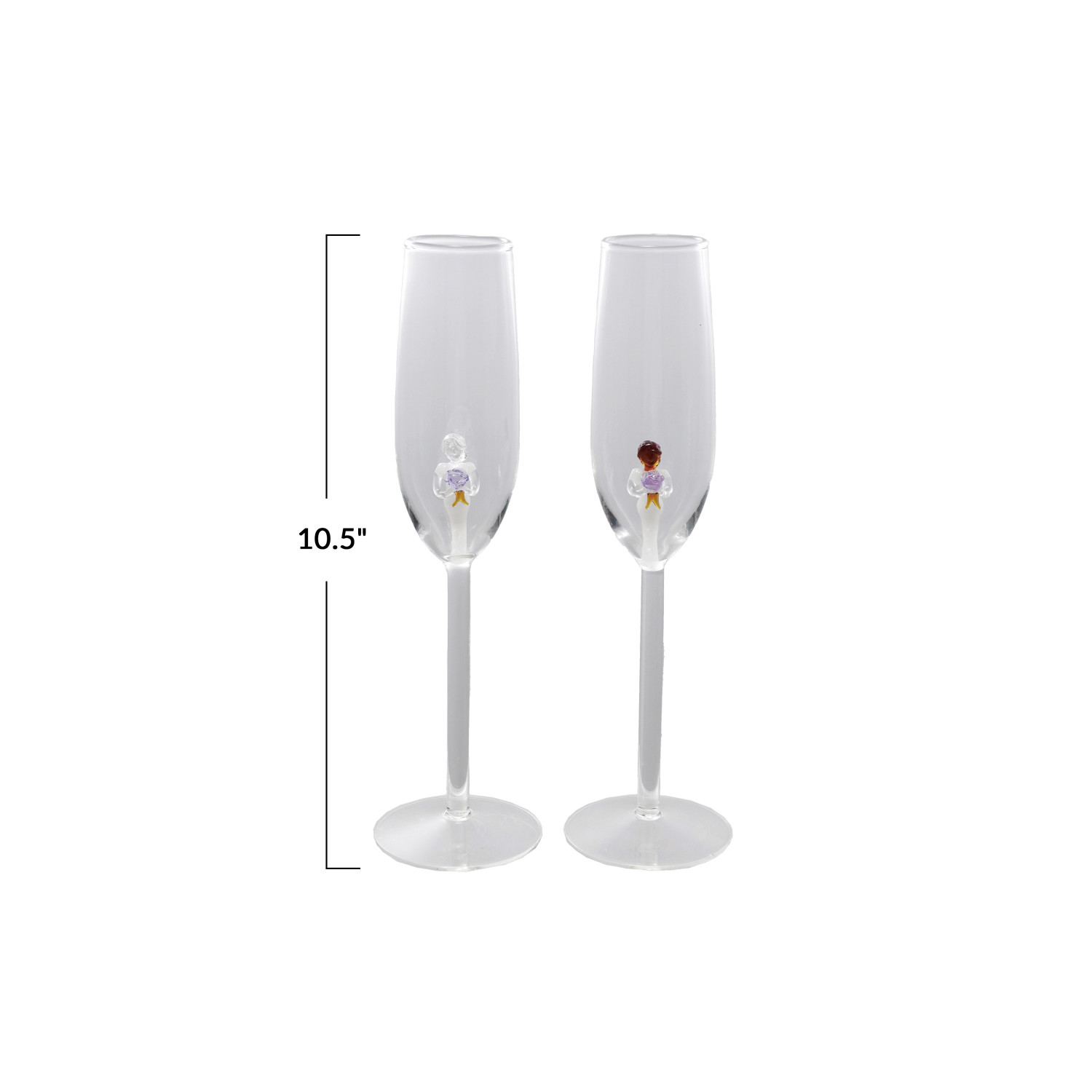 Catalog Name: 10-1/2"H 6 oz. Stemmed Champagne Glass w/ Hand-Blown Bride Inside, Multi Color, 2 Styles
