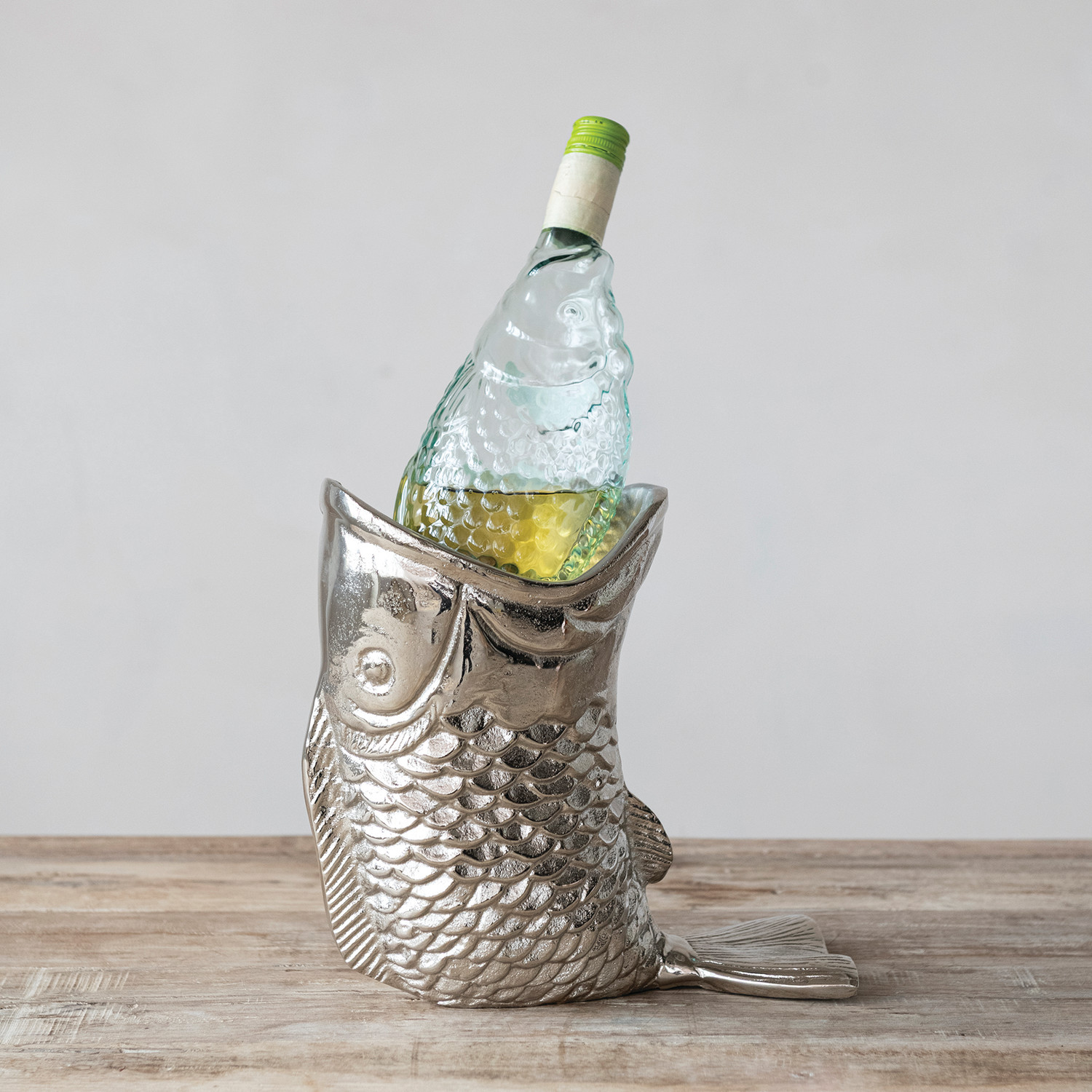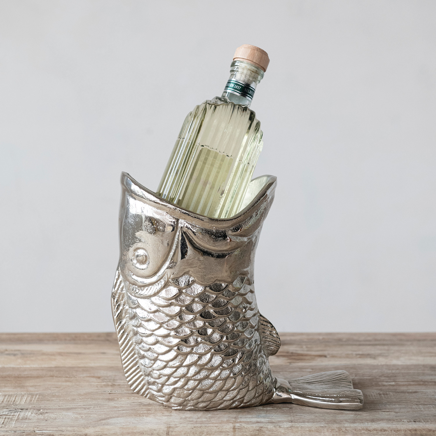 Catalog Name: 10-1/2"L x 5"W x 9-3/4"H Cast Aluminum Fish Shaped Bottle Holder, Nickel Finish