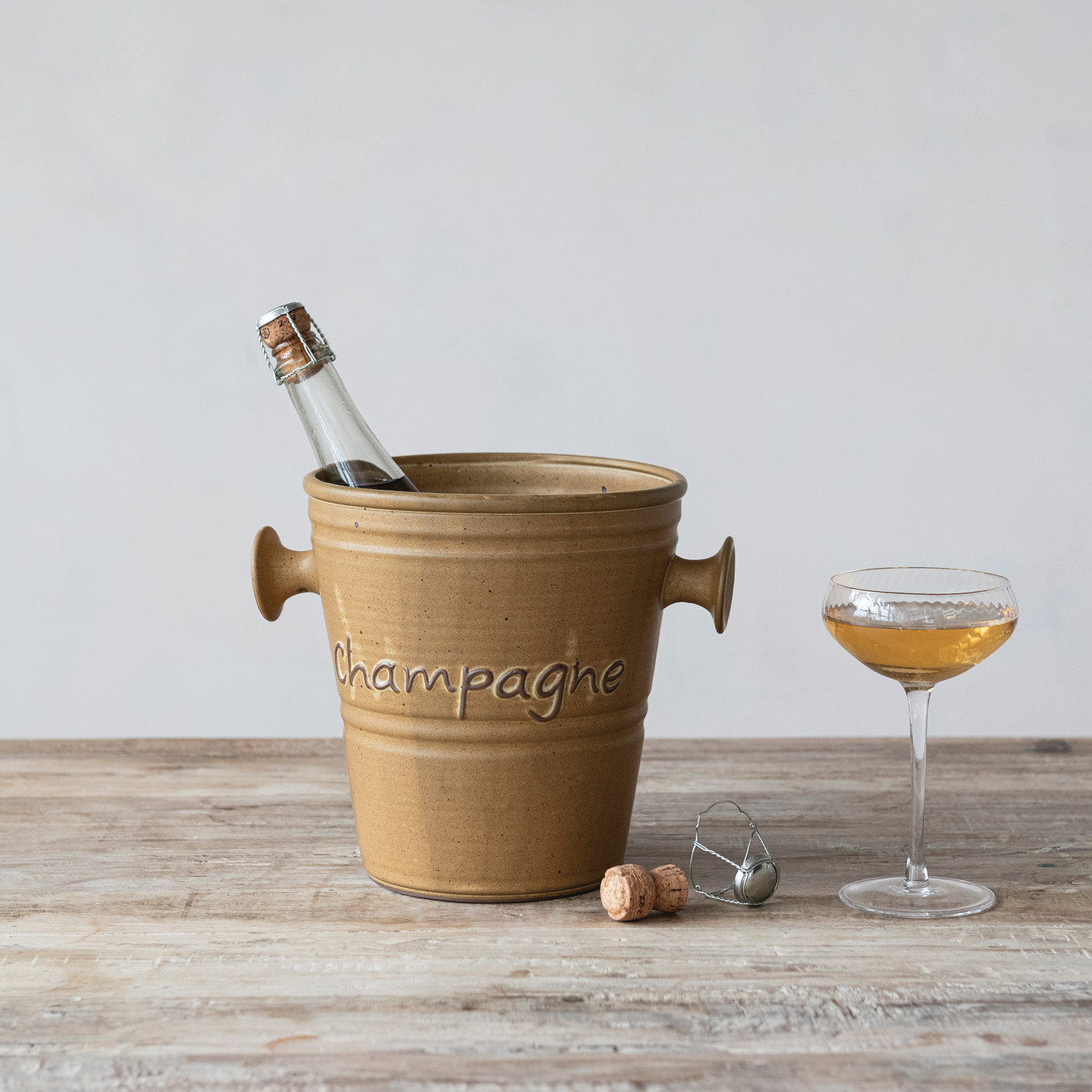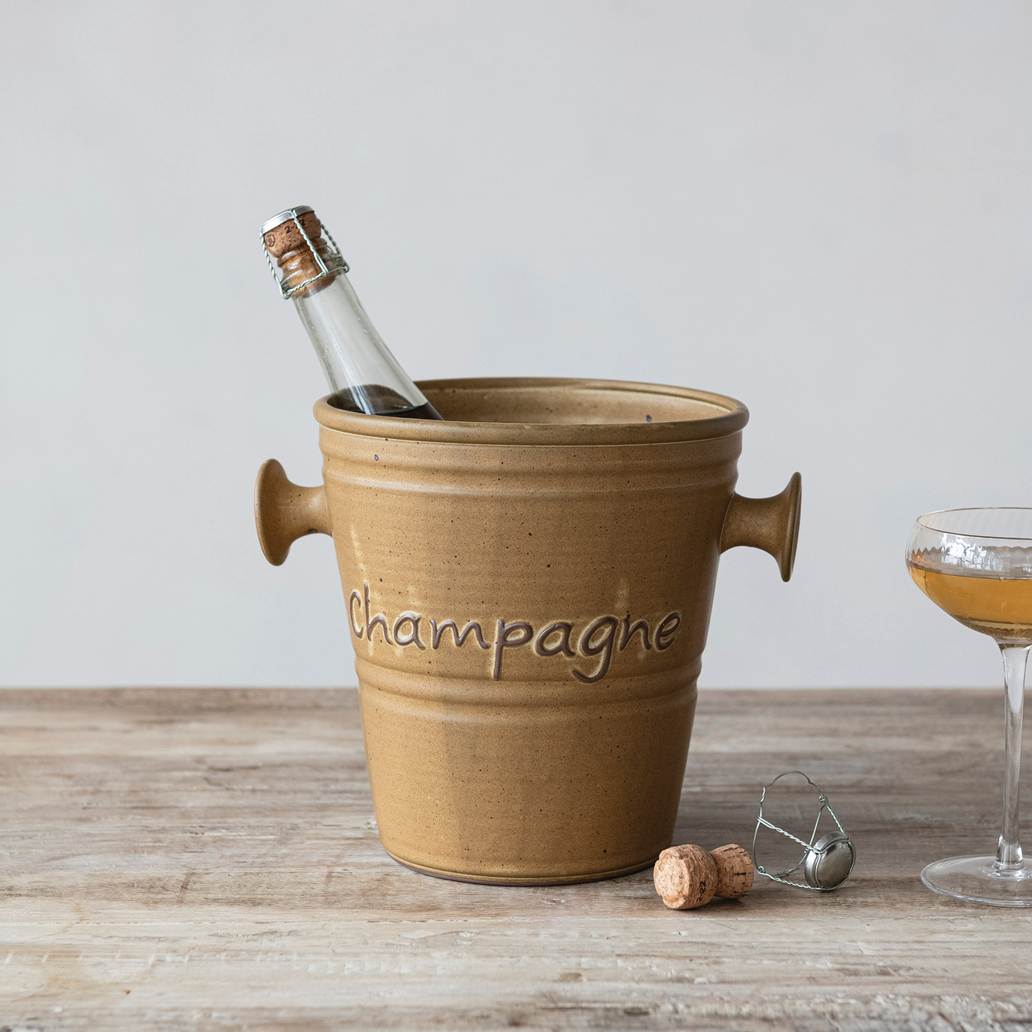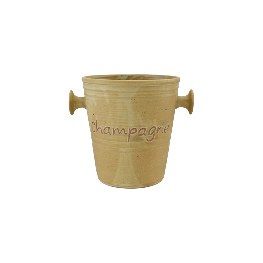 Catalog Name: 10-1/4"L x 8"W x 8-1/2"H 4 Quart Stoneware Vintage Reproduction Champagne Bucket w/ Handles "Champagne", Reactive Glaze, Brown (Each One Will Vary)
